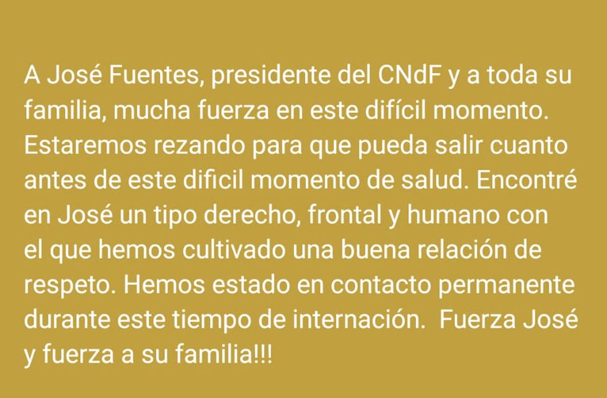 Y agregó: "Encontré en José un tipo derecho, frontal y humano con el que hemos cultivado una buena relación de respeto. Hemos estado en contacto permanente durante este tiempo de internación. Fuerza José y fuerza a su familia".