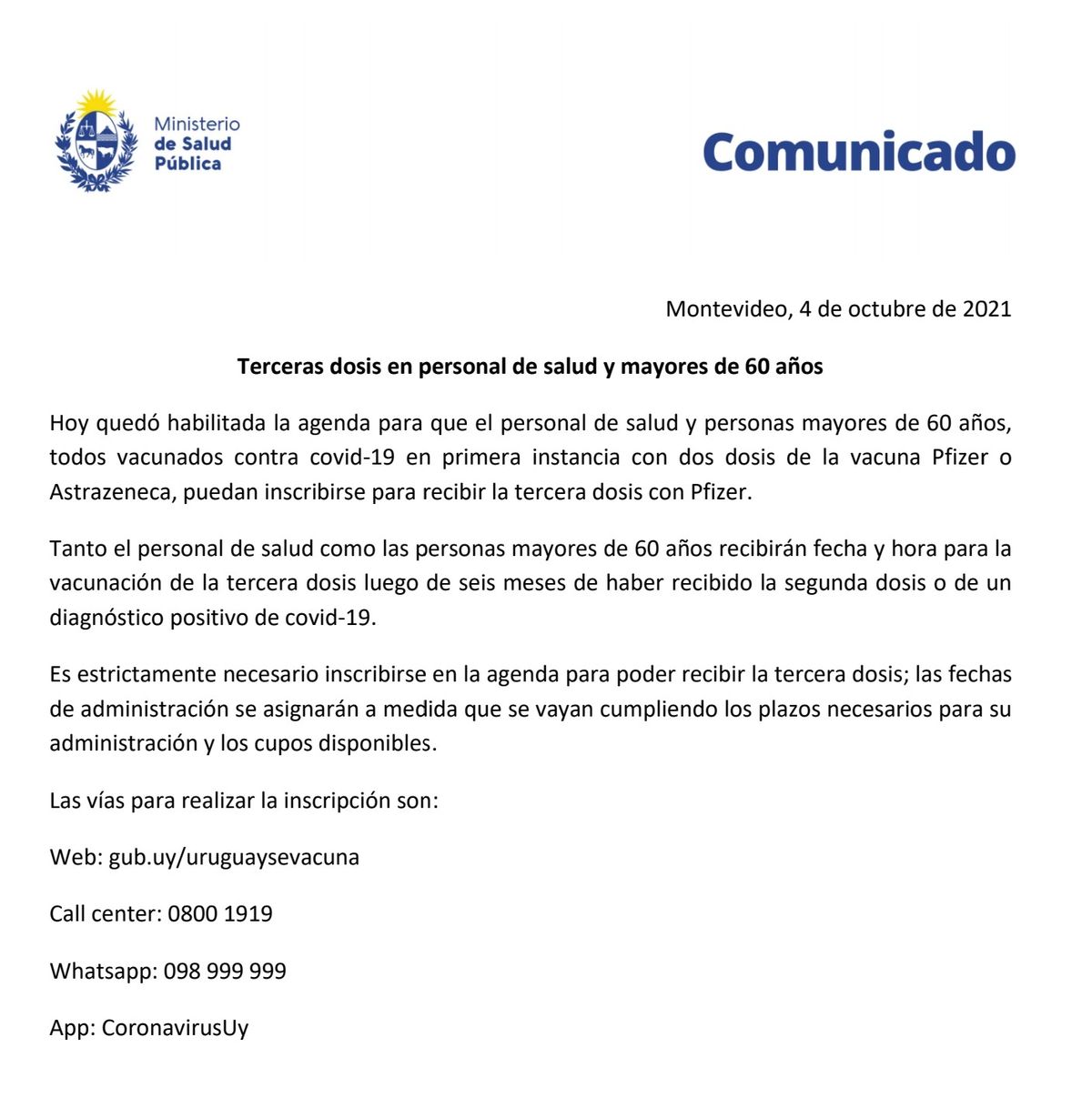 Se puede recibir la tercera dosis una vez cumplidos los seis meses de la segunda dosis. Esto se cumple a mediados de octubre, según informaron las autoridades.