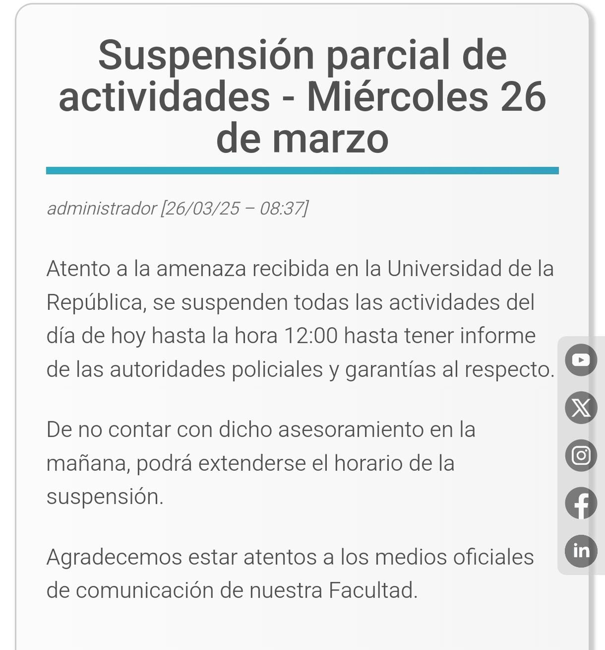 Desde el Ministerio del Interior se informó a Subrayado que la amenaza llegó por mail a la Facultad y que hablaba de "agresiones" a las personas que estuvieran en el centro universitario.