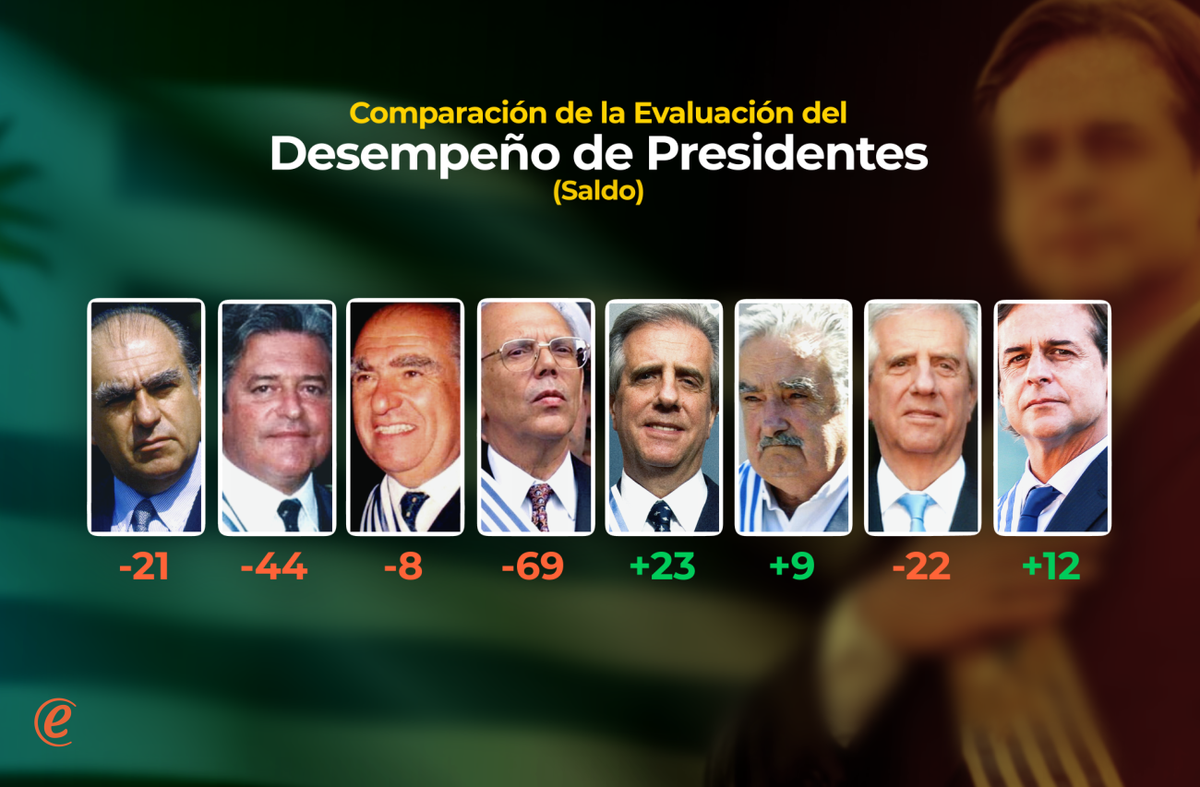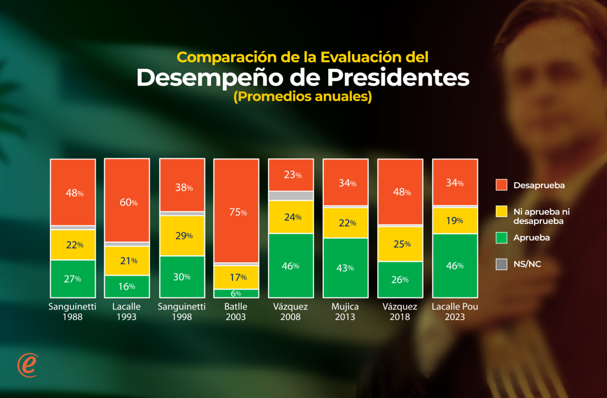 Los niveles actuales de Lacalle Pou son comparables a los que tuvo Mujica en promedio en 2013 (Mujica tenía algo menos de aprobación, y la misma desaprobación), aunque se encuentran por debajo de los que recibía Tabaré Vázquez en 2008. Aquel año, Vázquez promedió en el año el mismo nivel de aprobación que Lacalle Pou en 2023 (46%), pero aquél tenía una desaprobación significativamente menor (24%), por lo cual su saldo neto (+23) es el mejor de que se tiene registro hasta ahora a la misma altura del período.