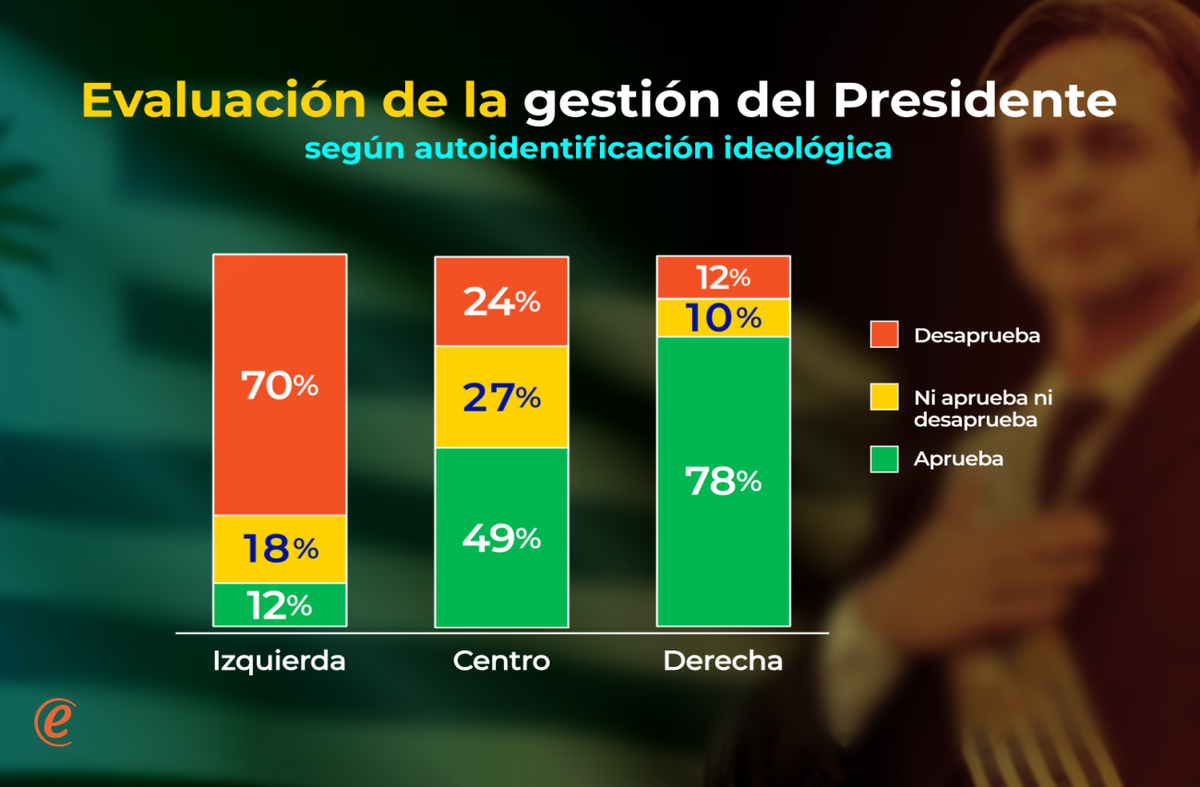 Las visiones de los uruguayos sobre el desempeño del presidente no son homogéneas en toda la población. Por ejemplo, están cortadas fuertemente por las posiciones ideológicas de los uruguayos. Entre quienes se definen a sí mismos como de “izquierda” o “centro-izquierda” la enorme mayoría (70%) desaprueba el desempeño de Lacalle Pou, y solo un 12% o aprueba (saldo neto de -58). Lo mismo ocurre, pero a la inversa, entre quienes se definen a sí mismos como de “derecha” o “centro-derecha”: 78% lo aprueban, y 10% lo desaprueban (saldo neto de +66). Por último, entre quienes se definen de “centro”, 49% aprueban el desempeño del presidente contra 24% que desaprueban (saldo neto +25).