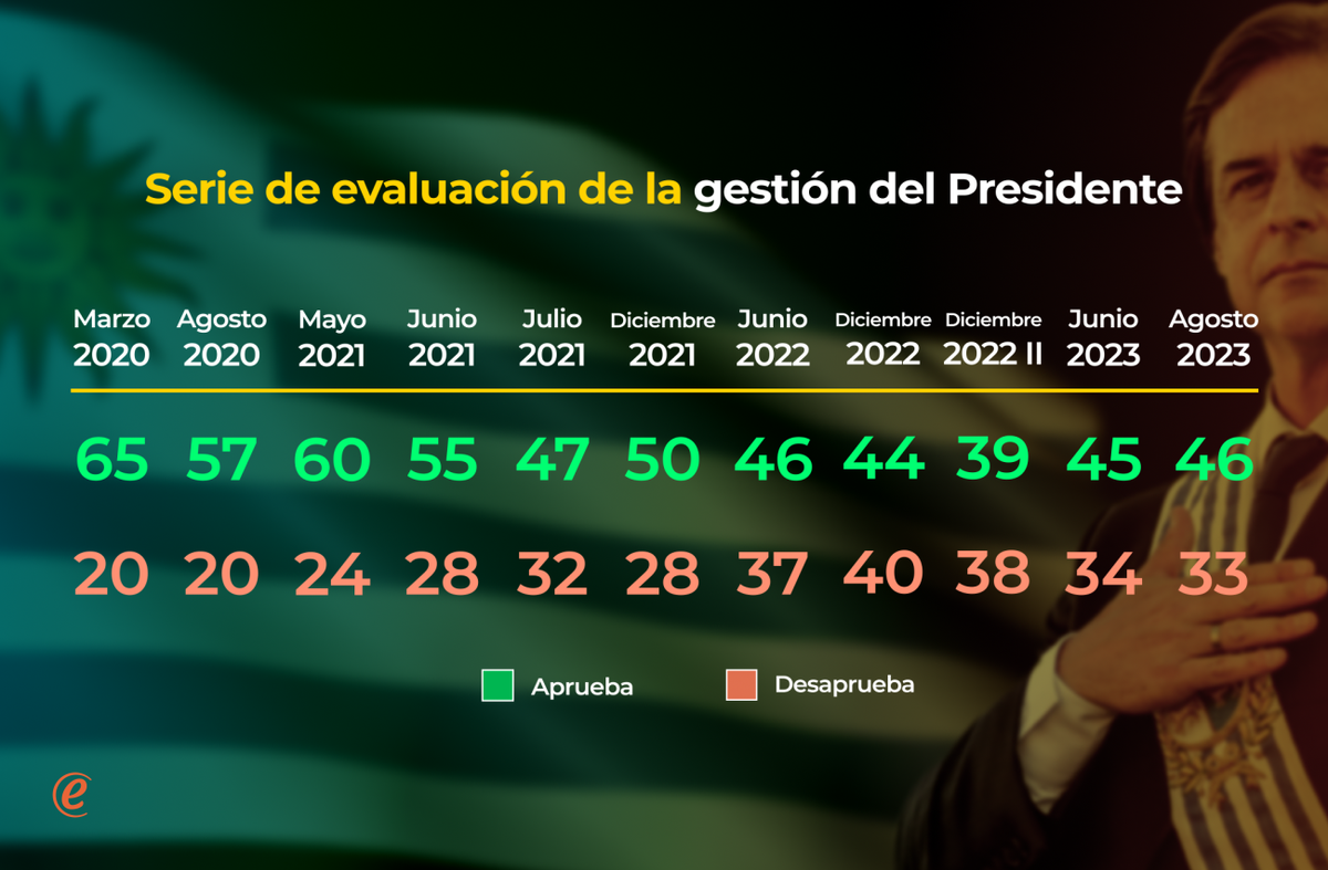 En agosto, algo menos de la mitad de la población (46%) aprueba la forma en que Luis Lacalle Pou se está desempeñando como presidente, y un tercio (33%) la desaprueba, según la encuesta de Equipos Consultores. Una quinta parte de los uruguayos (20%) tiene juicios intermedios, y 1% no opina. De esta forma, el saldo neto (resultante de la resta simple entre la aprobación y la desaprobación) es de +13.