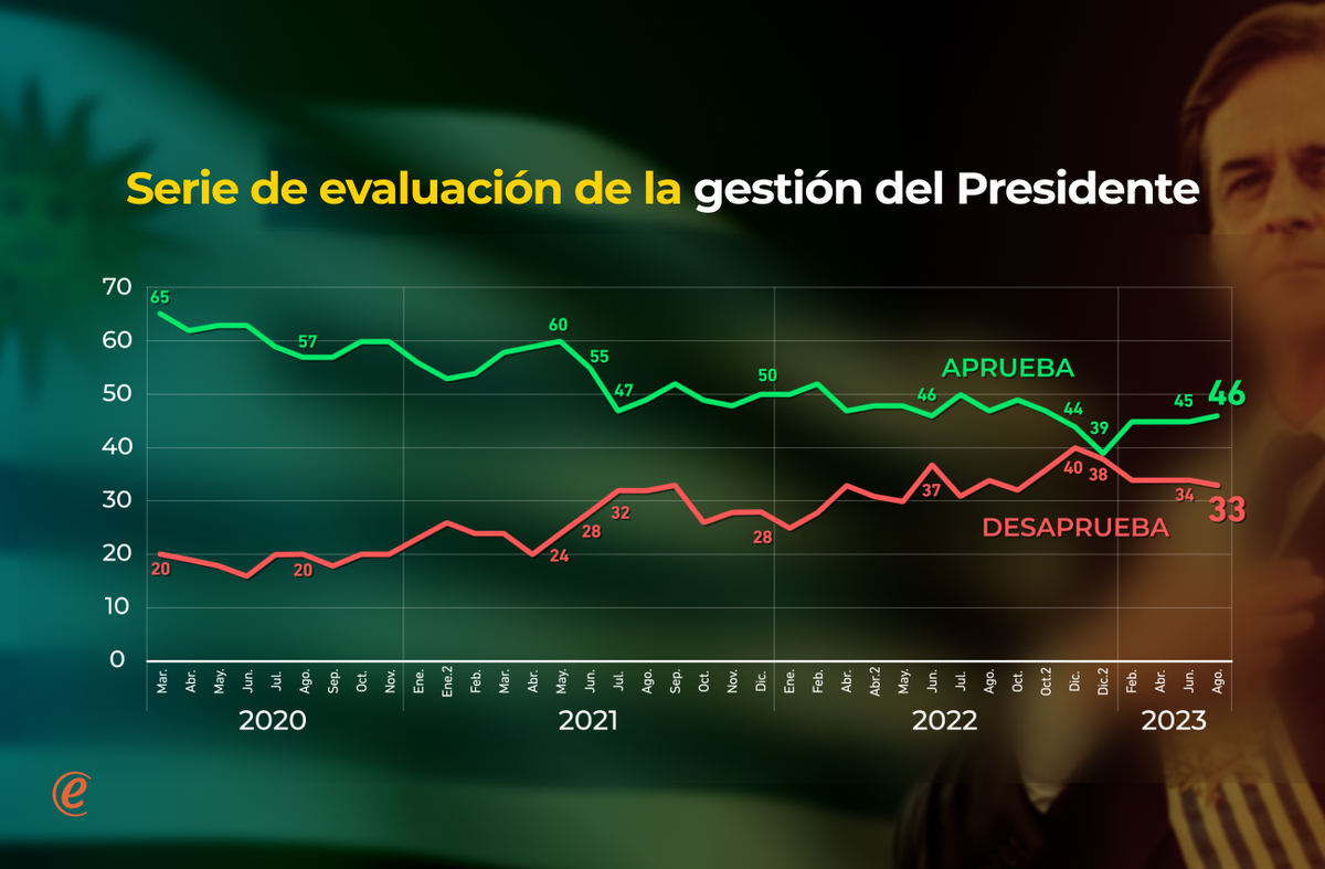 La evaluación del desempeño del mandatario obtiene en agosto un saldo neto positivo de 13 puntos, y se mantiene estable en lo que va de 2023. Los juicios están influidos por los alineamientos ideológicos, y la aprobación es mayor en el interior del país que en Montevideo.