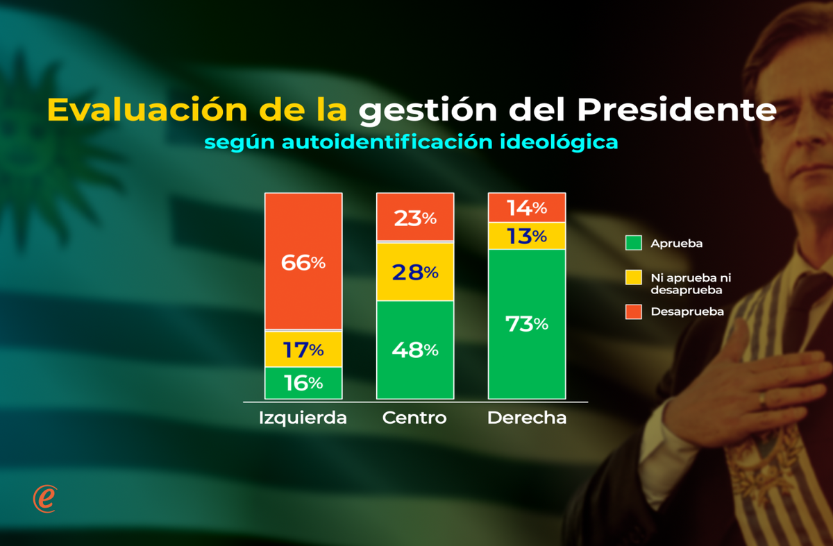 Adicionalmente, las miradas difieren fuertemente según la orientación ideológica de los entrevistados. Dentro de los uruguayos que se identifican a sí mismos con la “izquierda” o la “centro-izquierda”, predominan fuertemente los juicios críticos (16% aprueba y 66% desaprueba), con un saldo neto de -50. En cambio, entre los orientados a la “derecha” y “centro-derecha”, los resultados son prácticamente simétricos e inversos (73% de aprobación y 14% de desaprobación), con un saldo neto de +59. Finalmente, entre los identificados con el “centro” hay juicios más divididos pero de balance positivo (48% de aprobación y 23% de desaprobación), arrojando un saldo neto de +25.
