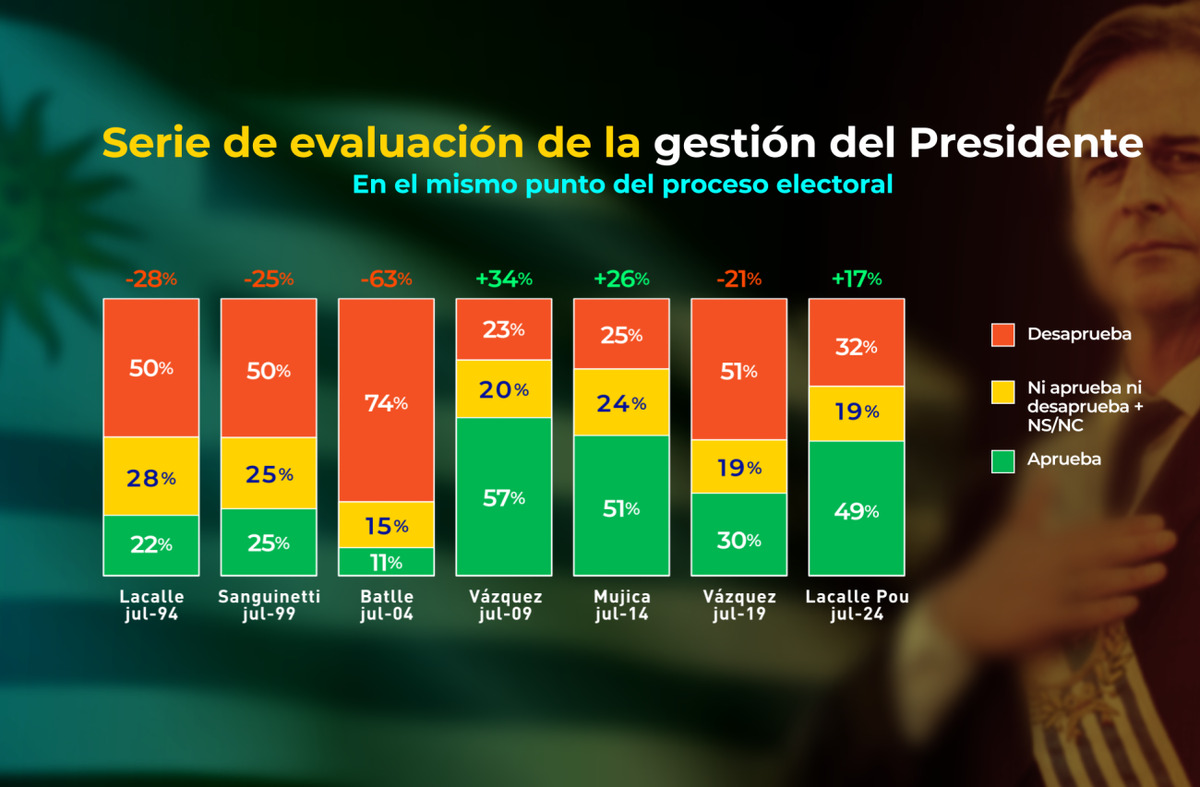 Mirado en perspectiva histórica, los juicios sobre Lacalle Pou son de los más favorables de los que se tiene registro, a la misma altura del ciclo. La mayoría de los presidentes anteriores, al llegar esta altura del gobierno, contaban con saldo negativo. Las excepciones hasta ahora eran Tabaré Vázquez durante su primer gobierno (julio de 2009) que llegaba con 57% de aprobación y 23% de desaprobación (saldo de +34), y José Mujica en julio de 2014, que marcaba 51% de aprobación y 25% de desaprobación (saldo de +26). Lacalle Pou se suma a este podio, con registros un poco por debajo de estos dos casos anteriores.