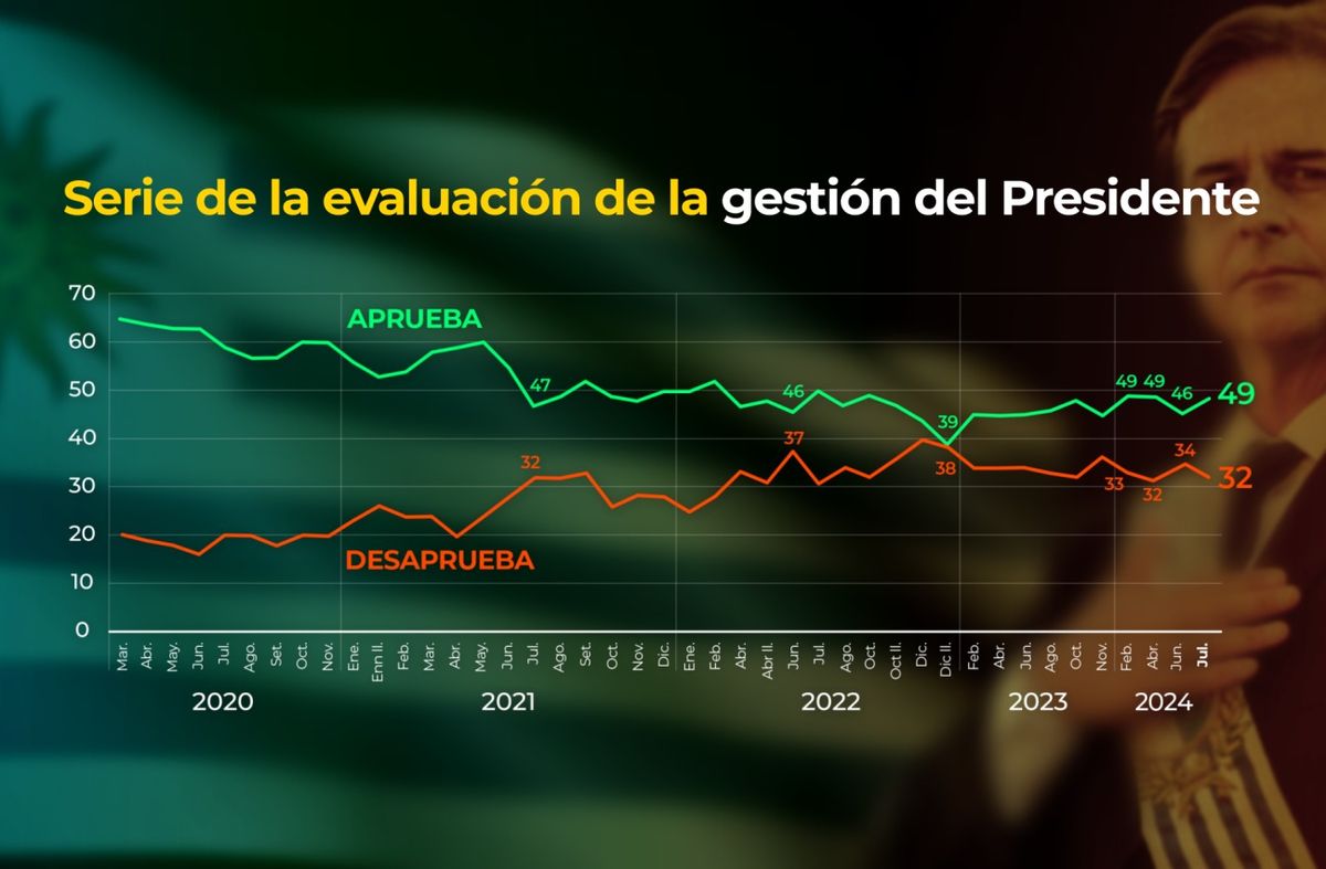 Al terminar julio casi la mitad (49%) de los uruguayos dijo aprobar el desempeño de Luis Lacalle Pou como presidente de la República y 32% dijo desaprobarlo. Casi un quinto de la población tiene juicios intermedios (18%) o no opina (1%). Con estos registros el saldo neto de evaluación presidencial es de +17, según la última encuesta de Equipos Consultores.