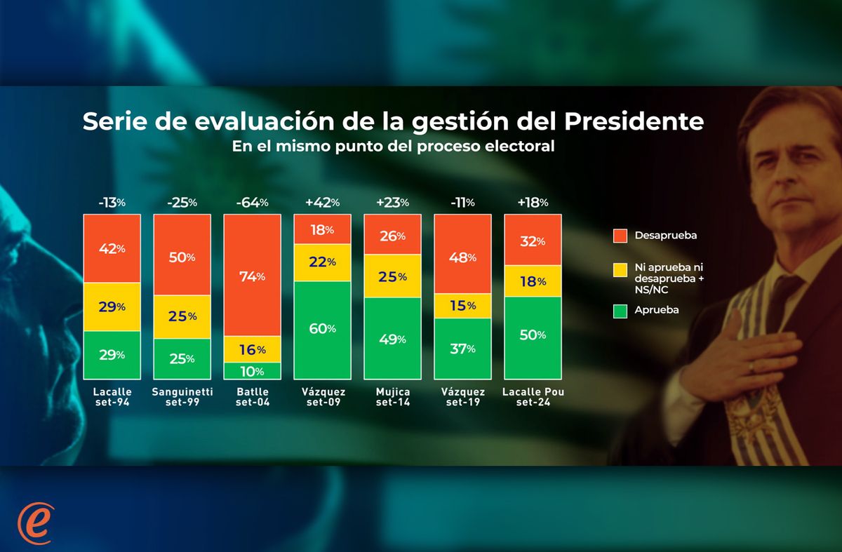 Cuando se analizan estos datos en perspectiva histórica, comparando con los que recibían presidentes anteriores a la misma altura de su período, se constata que es excepcional que un presidente llegue a su último semestre de gobierno con saldo positivo. Hasta el momento, solo lo habían logrado Tabaré Vázquez en su primer gobierno (que recibía un contundente 60% de aprobación en setiembre de 2009), y José Mujica en setiembre de 2014 (con 49% de aprobación). Lacalle Pou es el tercero en lograrlo, mientras que en todos los restantes ciclos de gobierno los presidentes entraron en la recta final con saldos netos claramente negativos.