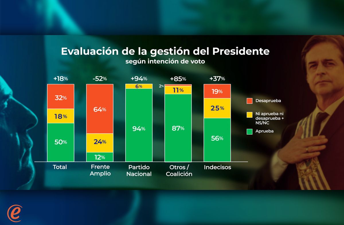 La aprobación del presidente es extraordinariamente alta entre los votantes del Partido Nacional (94%), y también muy alta entre los votantes de otros partidos de la Coalición (87%). Por el contrario, la amplia mayoría de los votantes frenteamplistas (64%) lo desaprueba. Finalmente, entre los indecisos el presidente también mantiene un saldo positivo importante (56% de aprobación y 19% de desaprobación).