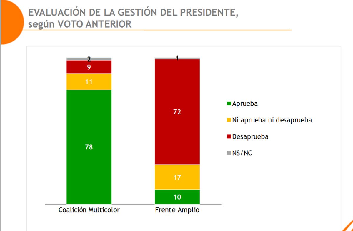 Las miradas entre los votantes de la Coalición Multicolor y los del Frente Amplio son casi antagónicas. Entre los primeros el presidente mantiene niveles muy altos de aprobación (78% contra 9% de desaprobación), mientras que entre los del Frente Amplio la situación es casi simétricamente inversa: 10% de aprobación y 72% de desaprobación. Estos registros entre los frenteamplistas son los más bajos que Lacalle Pou ha recibido hasta el momento.