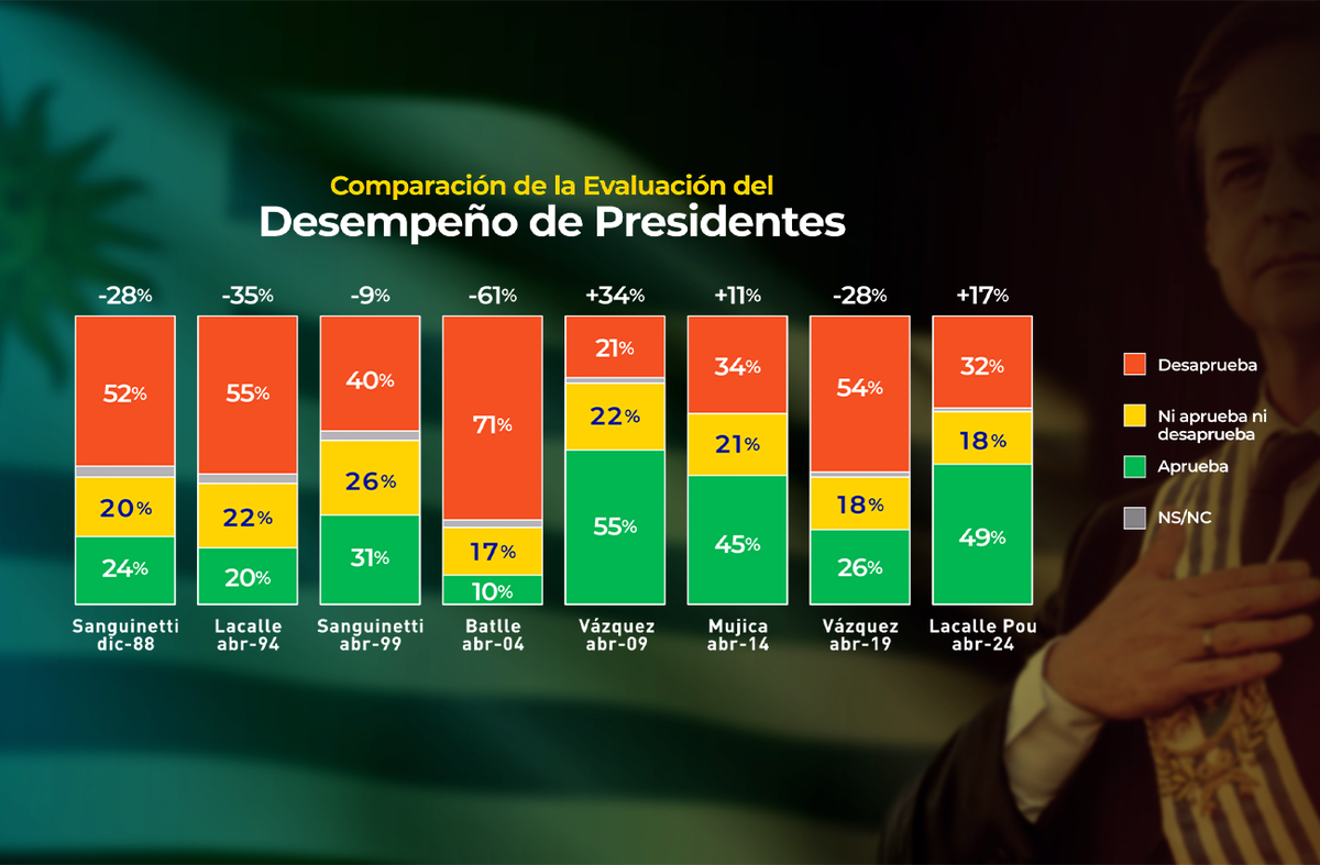 De todos los ciclos de gobierno post-dictadura, solo en tres ocasiones los presidentes han llegado a iniciar el último año de su gestión (año electoral) con saldo positivo. Estos fueron Tabaré Vázquez en 2009, José Mujica en 2014, y Lacalle Pou en 2024. El resto de los presidentes enfrentaron el año electoral en un clima de opinión predominantemente desfavorable. Los datos actuales de Lacalle Pou (+17) son incluso algo mejores que los que tenía Mujica en abril de 2014 (+11), aunque están distantes de los registros de Vázquez en su primera presidencia en 2009 (+34).