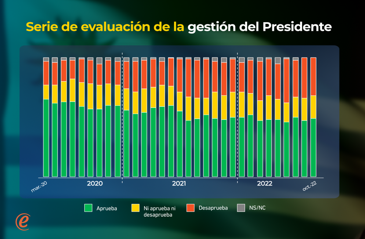 La medición es estable no solo respecto al dato inmediato anterior, sino que también muestra estabilidad en perspectiva de mediano plazo. Desde julio de 2021 hasta el presente los juicios sobre el presidente se mantienen dentro de un rango estrecho, con una aprobación promedio algo inferior al 50% y una desaprobación algo superior al 30%.