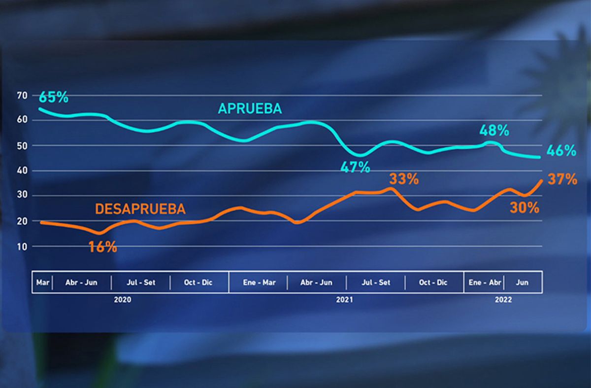 El presidente Luis Lacalle Pou registra el nivel más bajo de aprobación en lo que va del período de gobierno y el mayor porcentaje de desaprobación. El 46% de los uruguayos manifiesta aprobación con respecto al desempeño del mandatario y el 37% desaprobación, mientras que el 16% tiene juicios intermedios y el 1% no tiene opinión, según la última encuesta de Equipos Consultores.