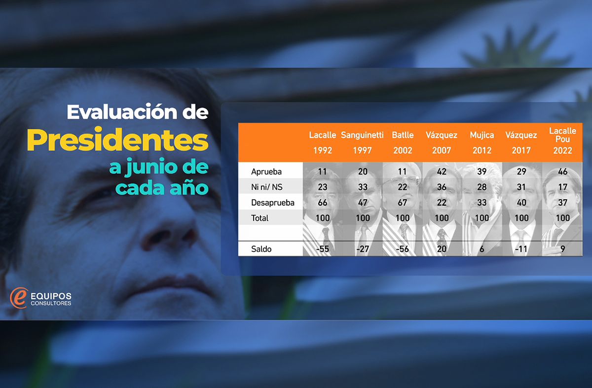 Sin embargo, si se considera el saldo neto (que incluye la desaprobación), Lacalle Pou ya no es el mejor evaluado. Vázquez en su primer gobierno marcaba un saldo neto de +20 a esta altura del período, Lacalle Pou recibe +9 y Mujica recibía +6. Todo el resto de los presidentes (Lacalle Herrera, Sanguinetti, Batlle, y Vázquez en su segundo período) se encontraban ya en zona de saldo negativo.