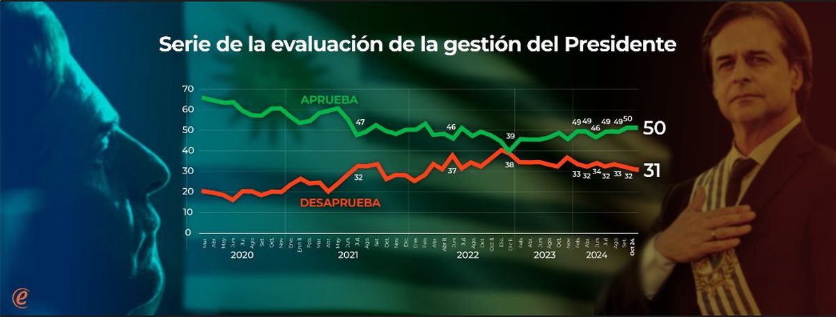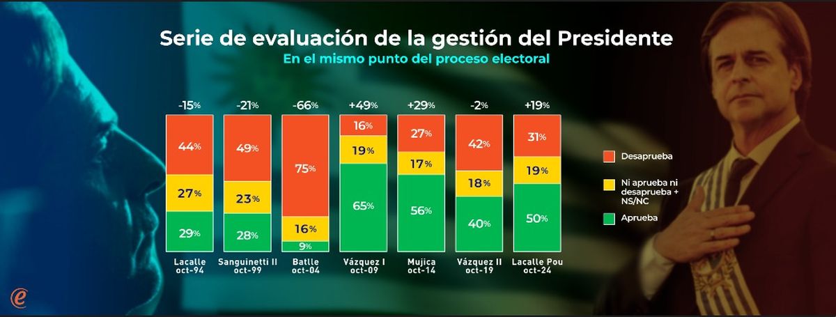 Con estos datos, Lacalle Pou se transforma en el tercer presidente que llega al mes electoral con saldo positivo (+19). Los anteriores habían sido Tabaré Vázquez en octubre de 2009 (saldo neto de +49) y José Mujica en octubre de 2014 (saldo neto de +29). El resto de los presidentes anteriores llegó a este punto del período electoral con saldo negativo.