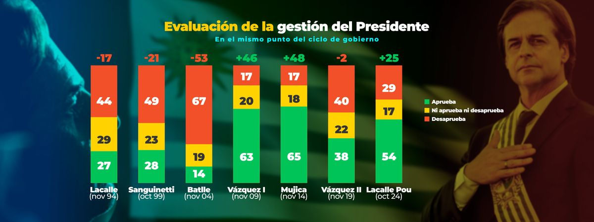 Con estos datos Lacalle Pou continúa manteniéndose como el tercer presidente posdictadura (junto con Vázquez en su primera administración, y con Mujica) que llega al final de su período con saldo positivo. Al igual que estos, creciendo en el tramo final. En noviembre, puntualmente, por debajo de los registros que ambos recibían en el mismo momento del ciclo (63% y 65% de aprobación respectivamente).