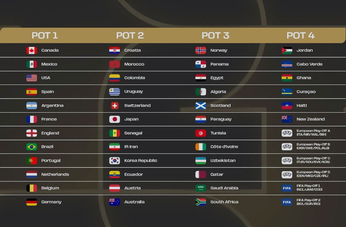 Bombo 4: Jordania, Cabo Verde, Ghana, Curasao, Haití, Nueva Zelanda, clasificados A, B, C y D de las eliminatorias europeas, más clasificados 1 y 2 del torneo clasificatorio de la FIFA.