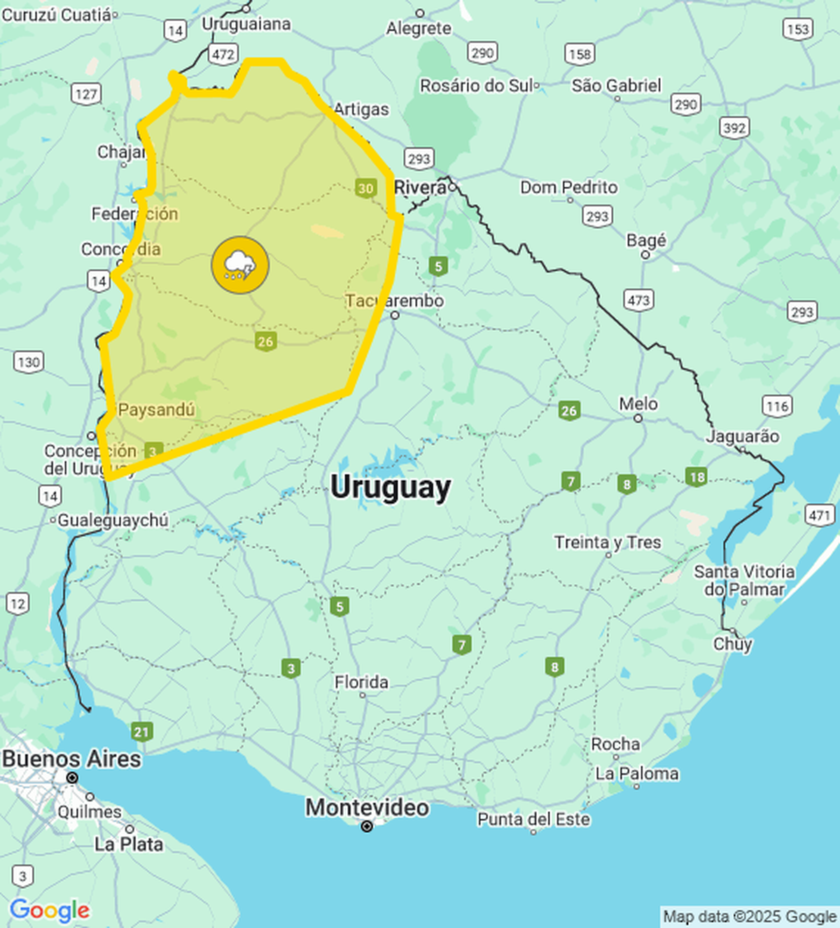 El Instituto Uruguayo de Meteorología (Inumet) actualizó la alerta amarilla que emitió a primera hora de la tarde de este martes para localidades del norte del país, por tormentas fuertes y lluvias intensas. La próxima actualización es a las 20:00 horas.