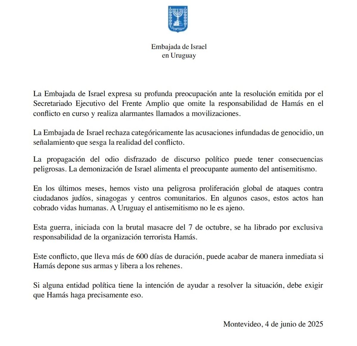 En un comunicado, la Embajada de Israel en Uruguay expresó "profunda preocupación" por el comunicado del Frente Amplio que "omite la responsabilidad de Hamás en el conflicto en curso" y que además "realiza alarmantes llamados a movilizaciones".