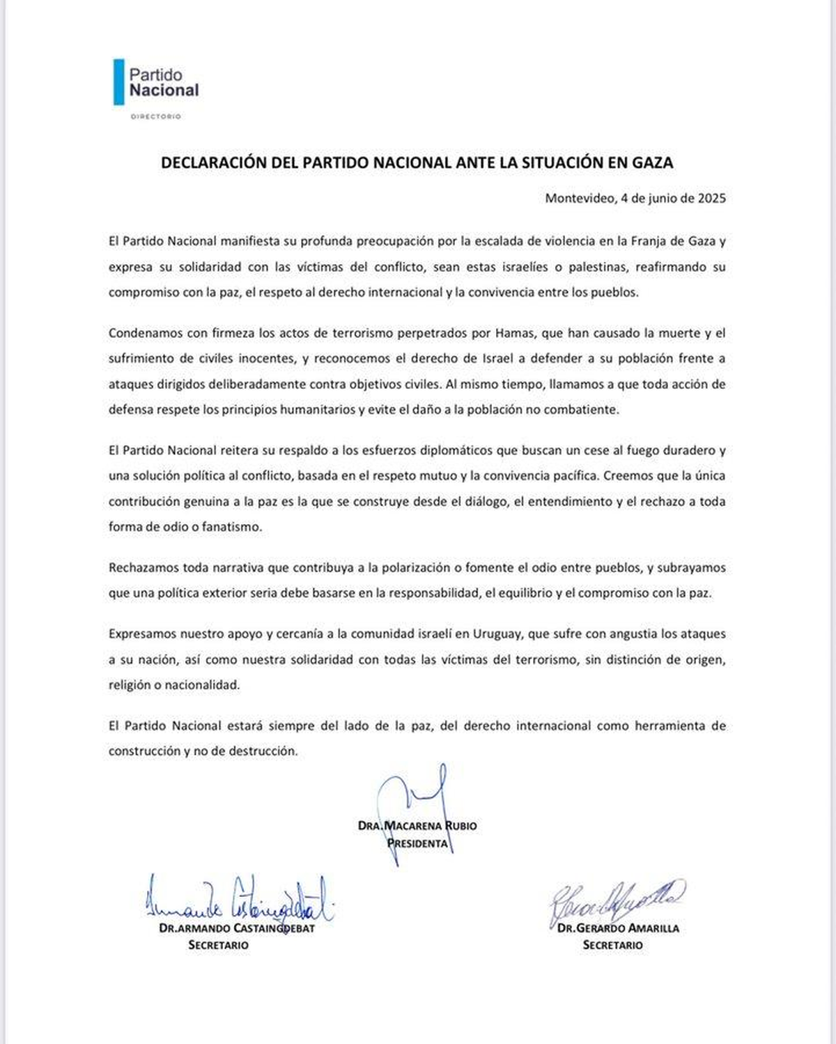 En tanto, el Comité Ejecutivo Nacional (CEN) del Partido Colorado condenó la declaración del Frente Amplio por convocar una movilización contra Israel. El secretario general del partido, Andrés Ojeda, lamentó y se mostró sorprendido y preocupado por la convocatoria a movilizarse.