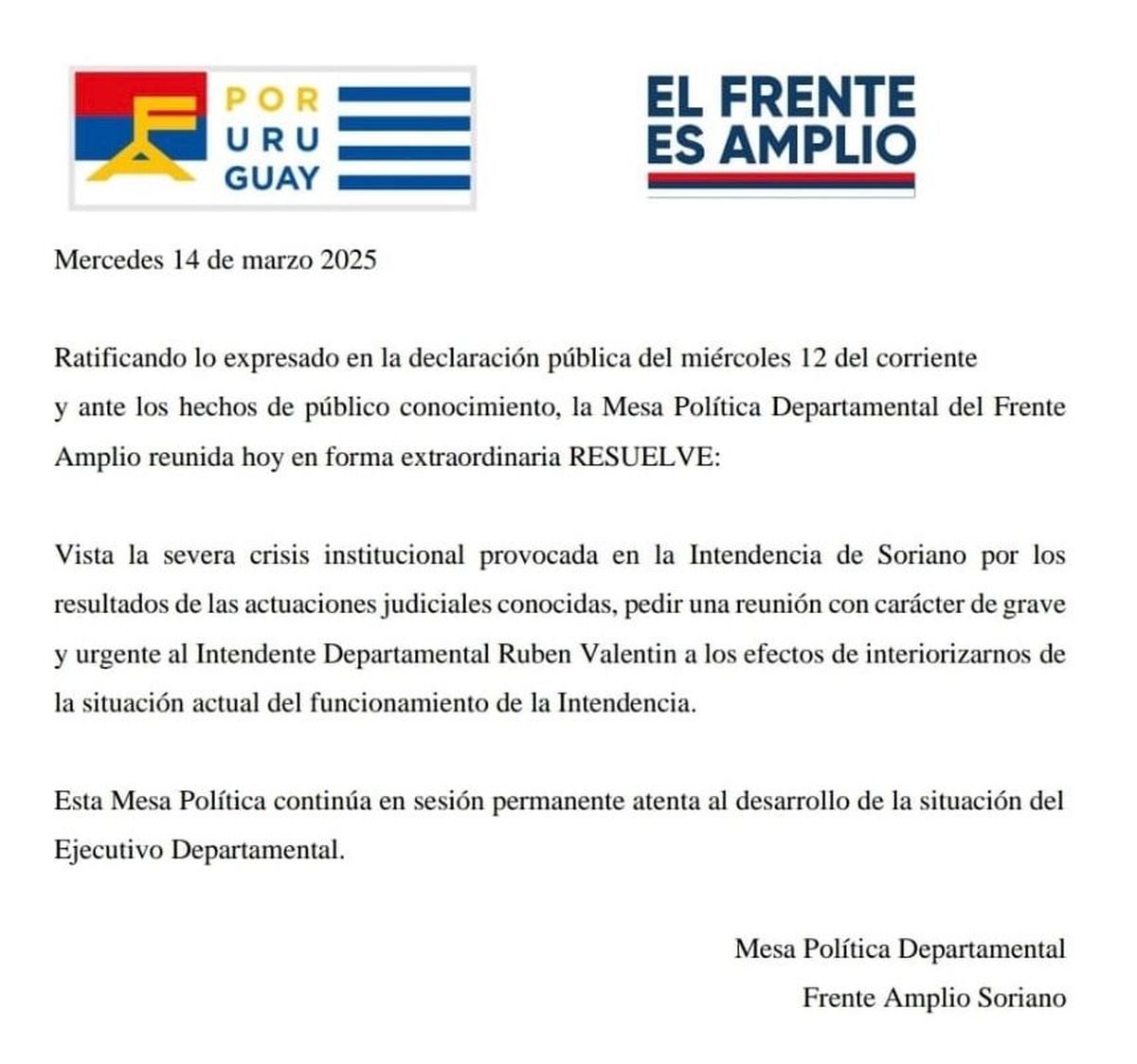 La Mesa Política Departamental del Frente Amplio de Soriano se reunió este viernes de forma extraordinaria y resolvió citar de forma grave y urgente al intendente Ruben Valentín a los efectos de conocer de primera mano el actual funcionamiento de la comuna.