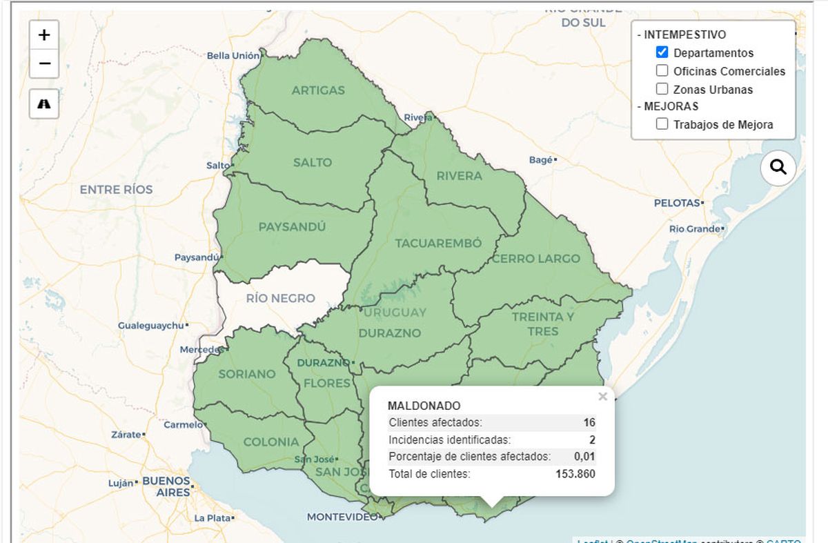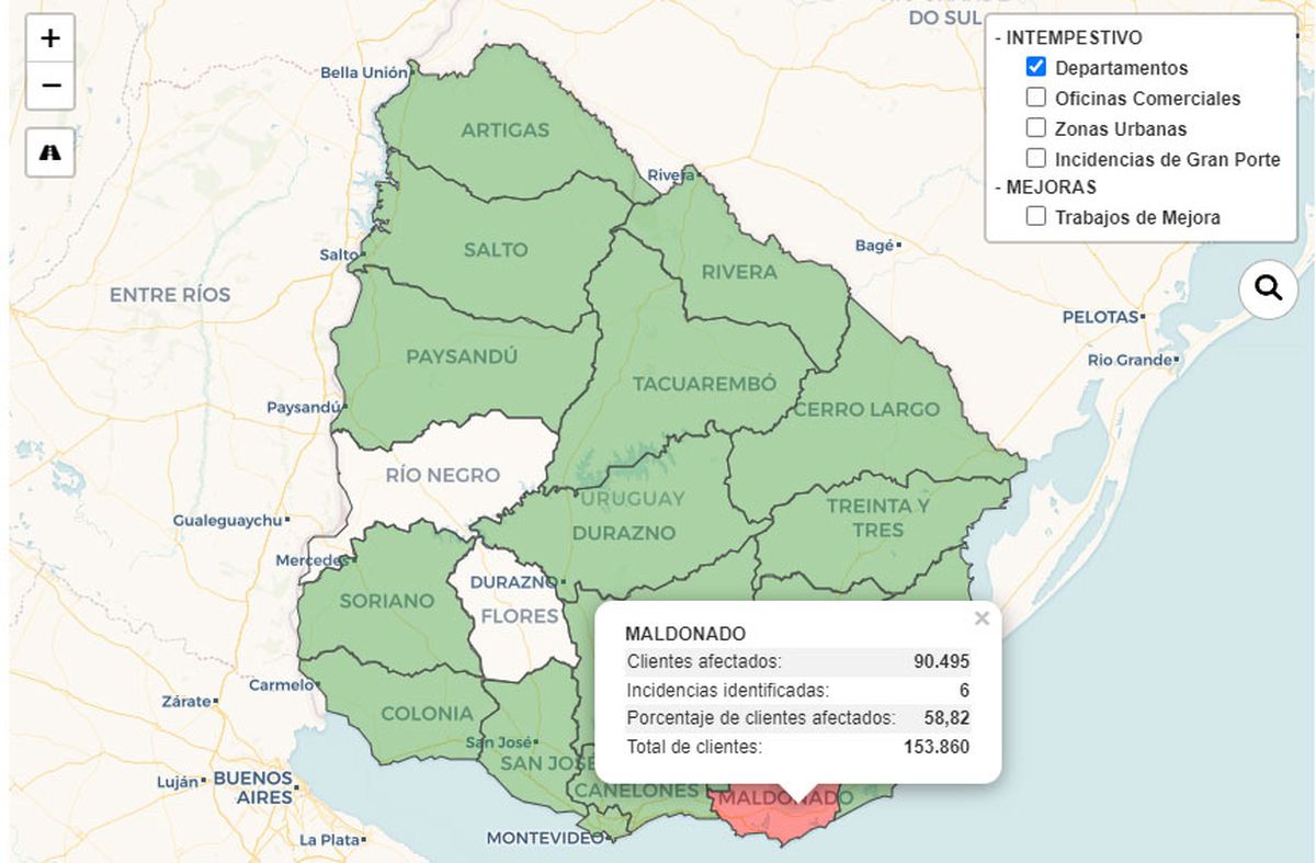 Media hora más tarde el desperfecto en el suministro se había solucionado y prácticamente todos los clientes de Maldonado tenían luz, según el monitor de UTE.