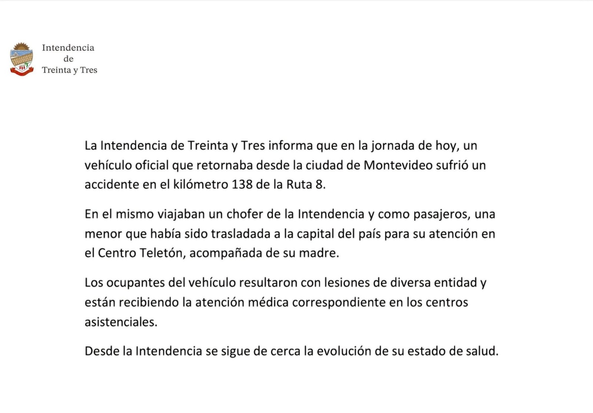 La niña había viajado con su madre a Montevideo para atenderse en el Centro Teletón, y juntas volvían a Treinta y Tres en una camioneta oficial de la Intendencia, conducida por un hombre de 29 años que recibió el alta.