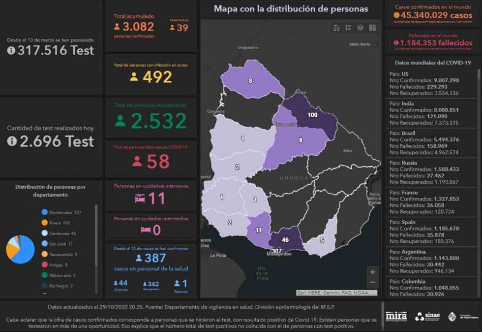 Montevideo sigue siendo el departamento con más casos activos hasta el momento; además hay once personas internadas en CTI.