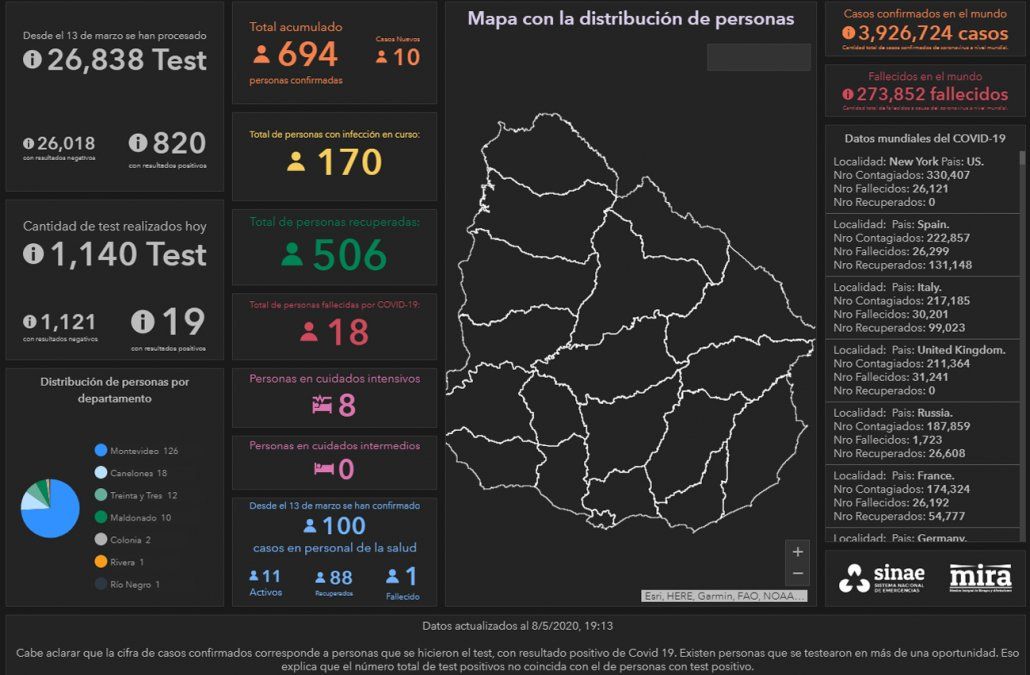 Según los últimos datos relevados por el Sistema Nacional de Emergencias (SINAE) hasta el momento hay 170 personas que cursan la enfermedad y 8 de ellas se encuentran en cuidados intensivos.
