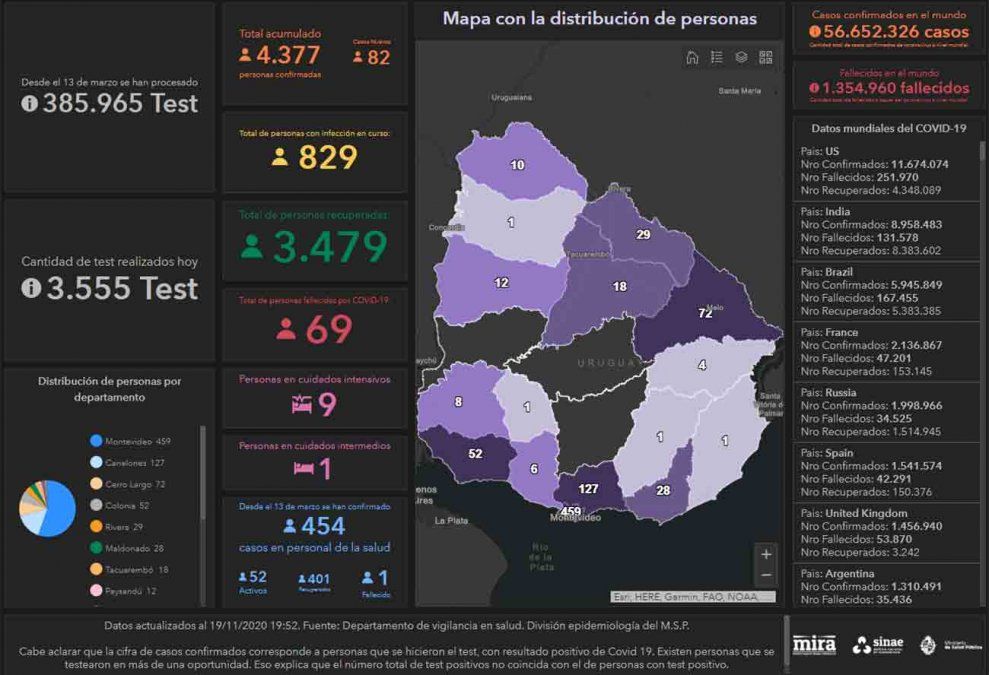 El SINAE aclaró que en la jornada de ayer "se reportaron 4296 casos positivos confirmados de Coronavirus COVID-19. Hoy se reportan 82 casos nuevos y un total de 4377 casos positivos confirmados. La diferencia se explica porque un ciudadano extranjero dio positivo y regresó a su país".