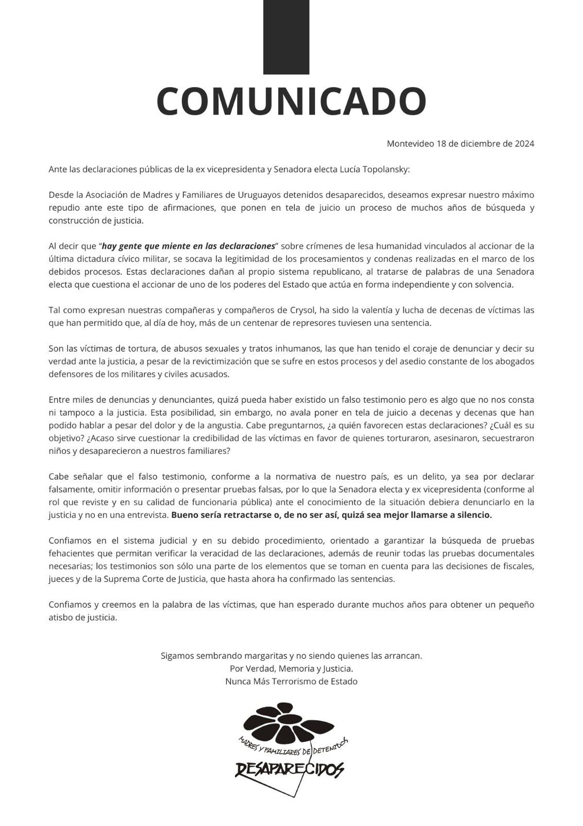 En tanto, la Asociación de Madres y Familiares de Uruguayos Detenidos Desaparecidos repudió las declaraciones de Topolansky. “Deseamos expresar nuestro máximo repudio ante este tipo de afirmaciones, que ponen en tela de juicio un proceso de muchos años de búsqueda y construcción de justicia”, señaló el colectivo en un comunicado.
