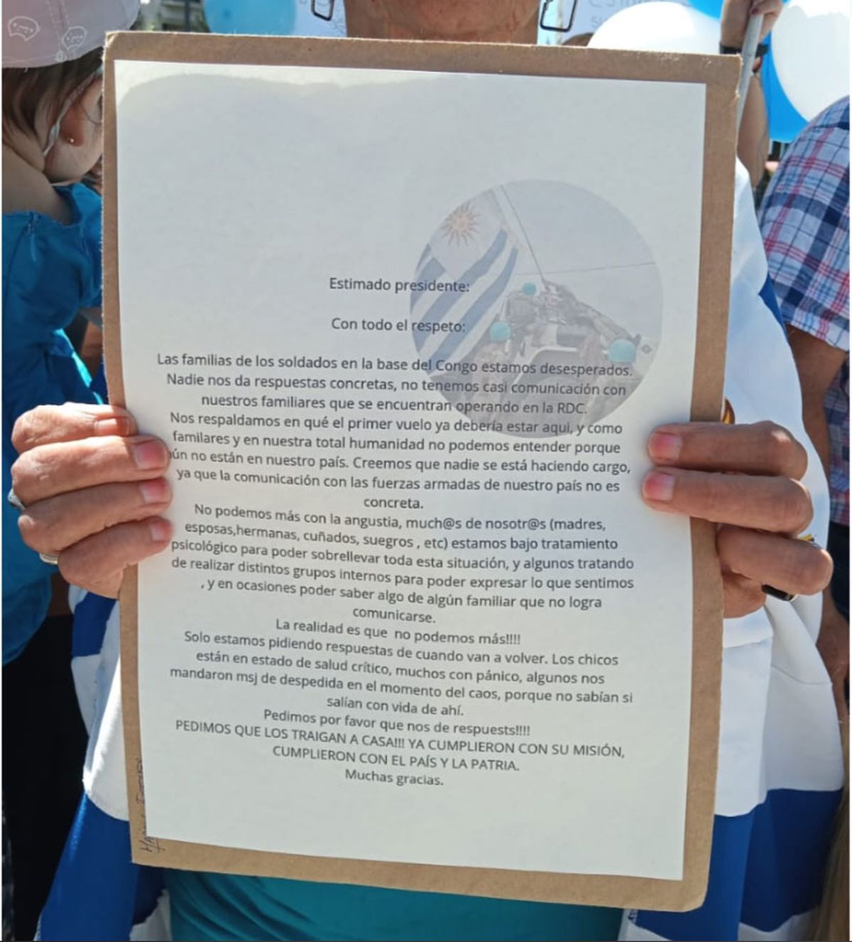 Familiares de los soldados uruguayos desplegados en la misión de Naciones Unidas en el Congo se manifestaron en plaza Independencia y le dejaron una carta al presidente Lacalle Pou.