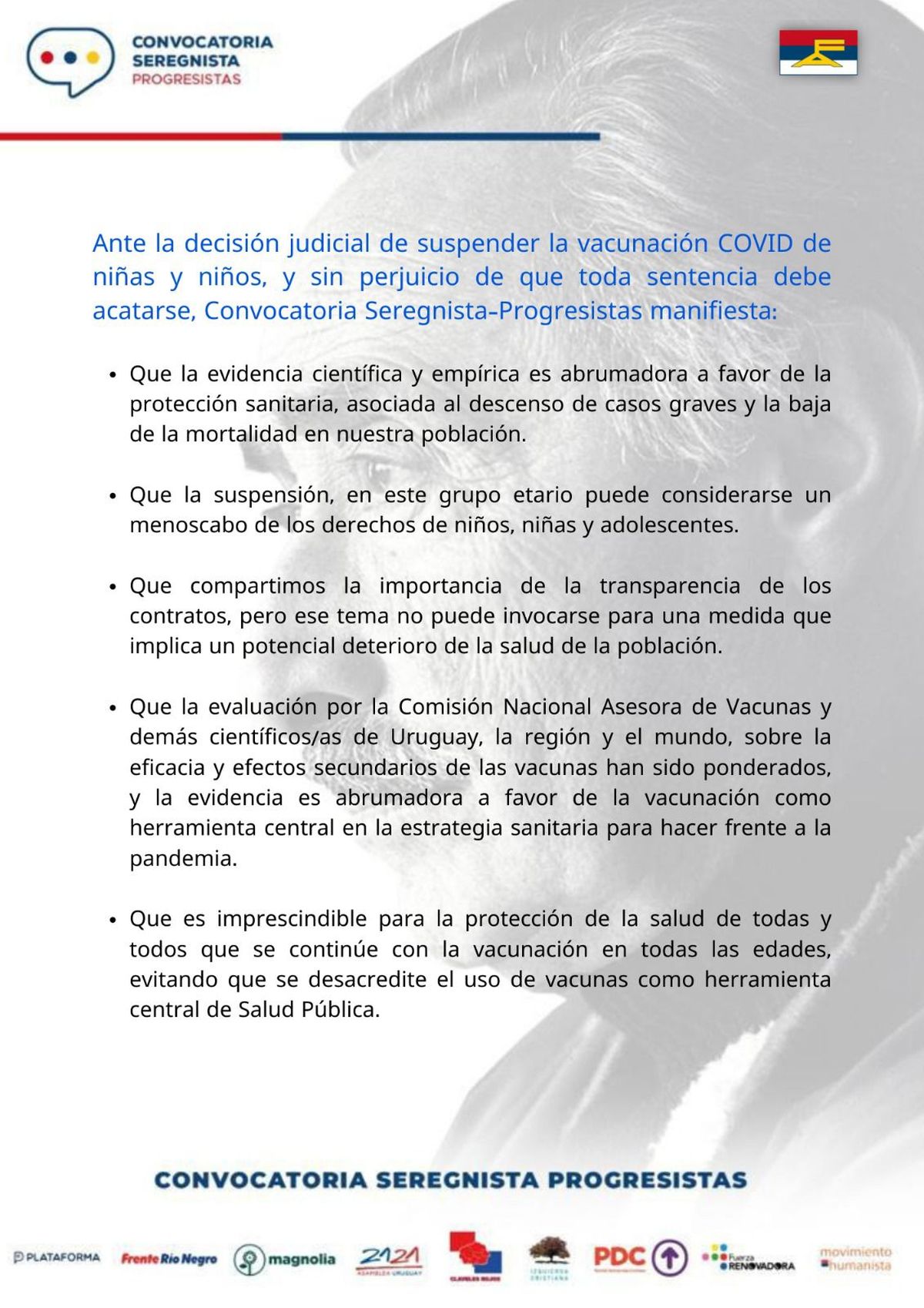 Por otra parte, la Convocatoria Seregnista-Progresistas manifestó que "la evidencia científica y empírica es abrumadora a favor de la protección sanitaria, asociada al descenso de casos graves y la baja de la mortalidad en nuestra población".