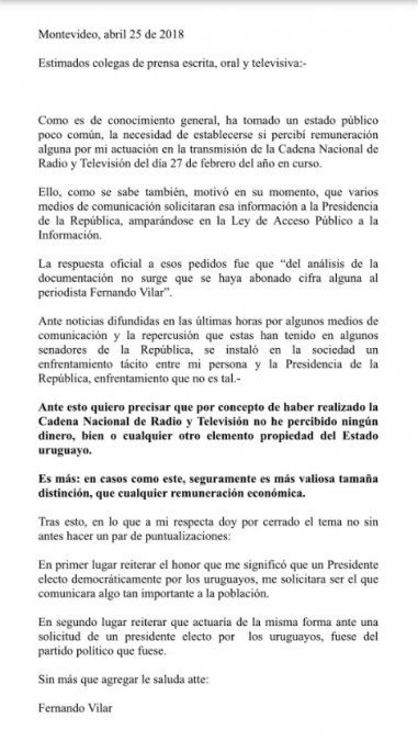 "Quiero precisar que por concepto de haber realizado la Cadena Nacional de Radio y Televisión no he percibido ningún dinero, bien o cualquier otro elemento propiedad del Estado uruguayo", señaló el periodista Fernando Vilar en una carta dirigida a la prensa.