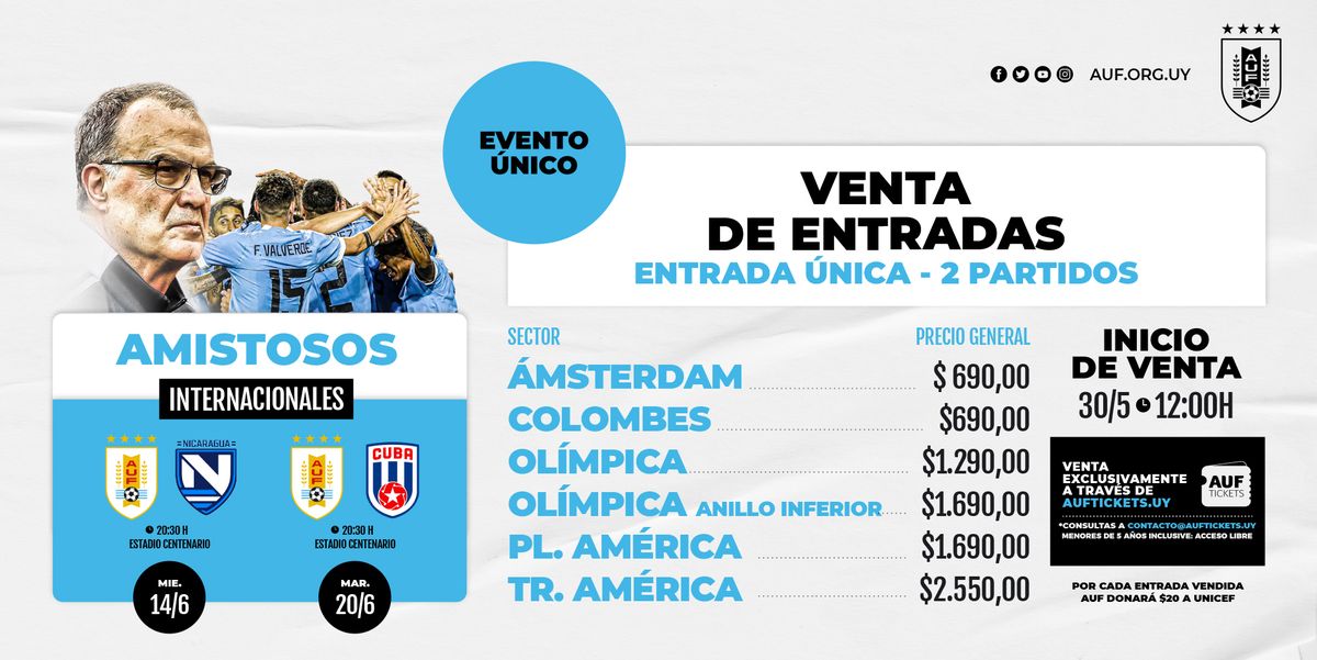 La Asociación Uruguaya de Fútbol (AUF) fijó el precio de las entradas para los amistosos de la Selección Uruguaya en junio, en lo que será el estreno de Marcelo Bielsa como entrenador Celeste.