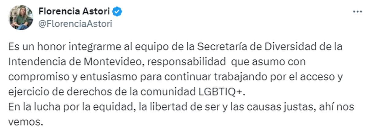 "Responsabilidad que asumo con compromiso y entusiasmo para continuar trabajando por el acceso y ejercicio de derechos de la comunidad LGBTIQ+. En la lucha por la equidad, la libertad de ser y las causas justas, ahí nos vemos", agregó.