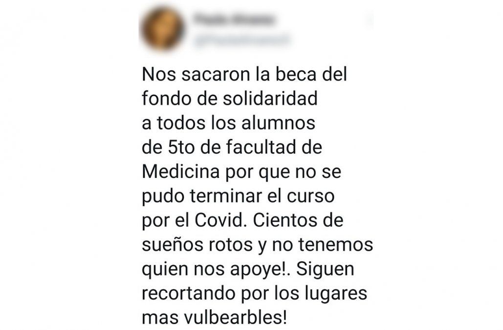 Varios estudiantes, particularmente de Medicina, advirtieron en redes sociales de la situación. Una de ellas, indicó que les retiraron la beca a todos los estudiantes de 5º de la carrera porque no se pudo terminar el curso por el Covid. “Cientos de sueños rotos y no tenemos quien nos apoye! Siguen recortando por los lugares más vulnerables!”, publicó.