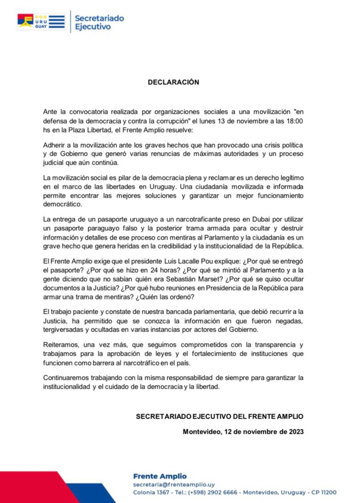 Además agrega que el Frente Amplio exige que el presidente Luis Lacalle Pou explique: ¿Por qué se entregó el pasaporte? ¿Por qué se hizo en 24 horas? ¿Por qué se mintió al Parlamento y a la gente diciendo que no sabían quién era Sebastián Marset? ¿Por qué se quiso ocultar documentos a la Justicia? ¿Por qué hubo reuniones en Presidencia de la República para armar una trama de mentiras? ¿Quién las ordenó?.