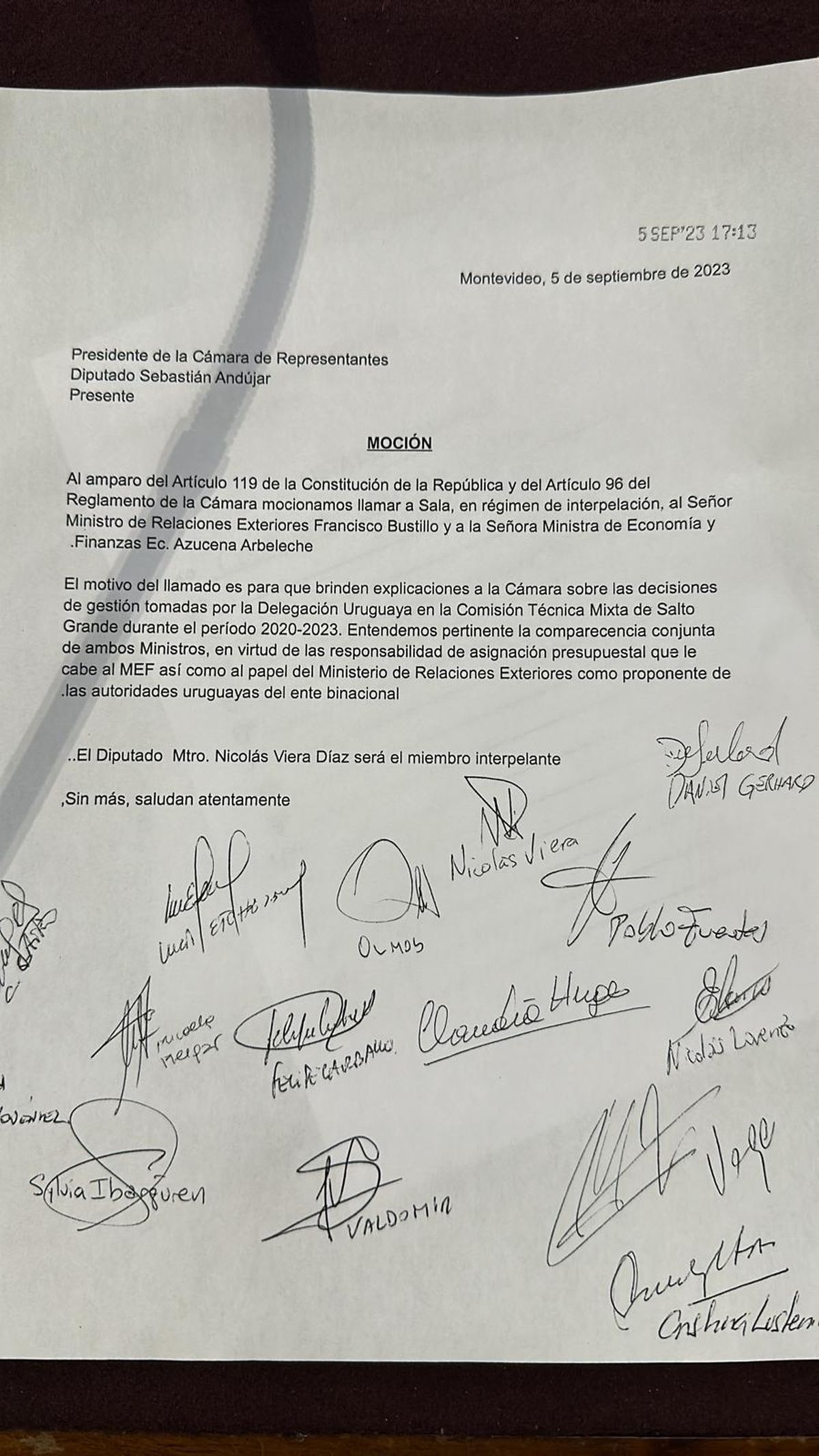 El diputado del Frente Amplio, Nicolás Viera, presentó este martes una moción en la Cámara de Representantes para interpelar a la ministra de Economía y Finanzas, Azucena Arbeleche, y al canciller Francisco Bustillo, por las denuncias de clientelismo político en la Comisión Técnico Mixta de Salto Grande en favor de ediles del Partido Nacional.