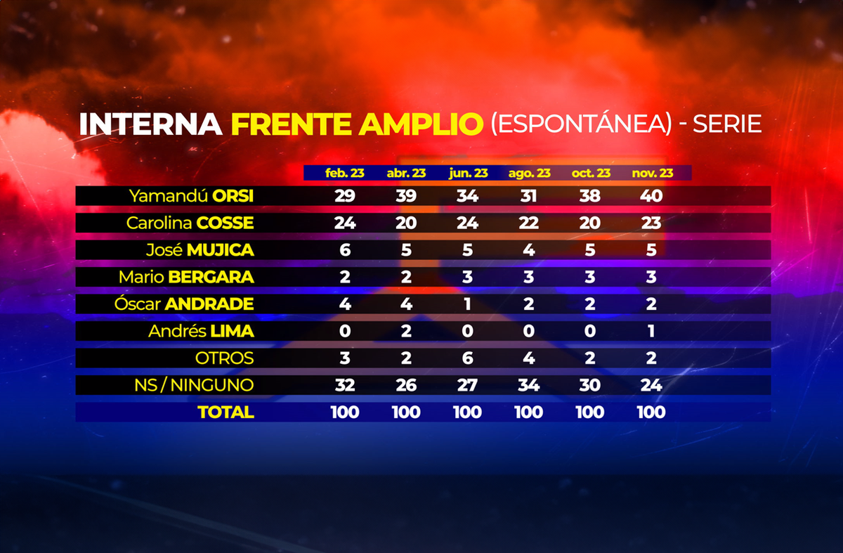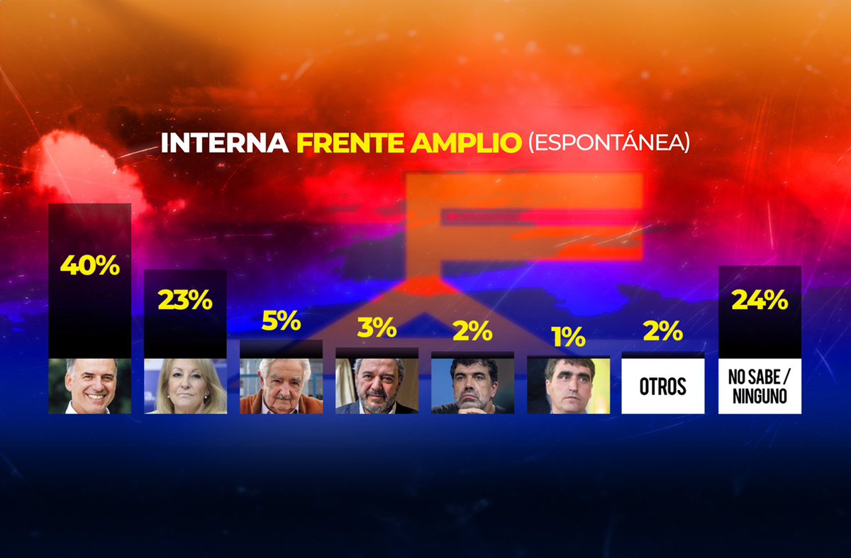En la interna del Frente Amplio, Yamandú Orsi lidera con 40%, seguido de Carolina Cosse con 23%. Muy por debajo de estos aparecen los otros candidatos en carrera, Mario Bergara (3%) y Andrés Lima (1%). El expresidente José Mujica, y el senador Óscar Andrade, que no serán candidatos, también reciben algunas menciones, según la última encuesta de Equipos Consultores.
