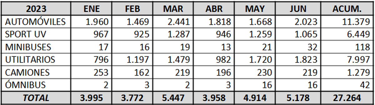 En junio, la venta de automóviles fue de 2.023 unidades, seguido por utilitarios con 1.823 unidades, luego la categoría “SUV” (vehículos deportivos utilitarios) con 1.065 y además, 219 camiones, 32 minibuses y 16 ómnibus.