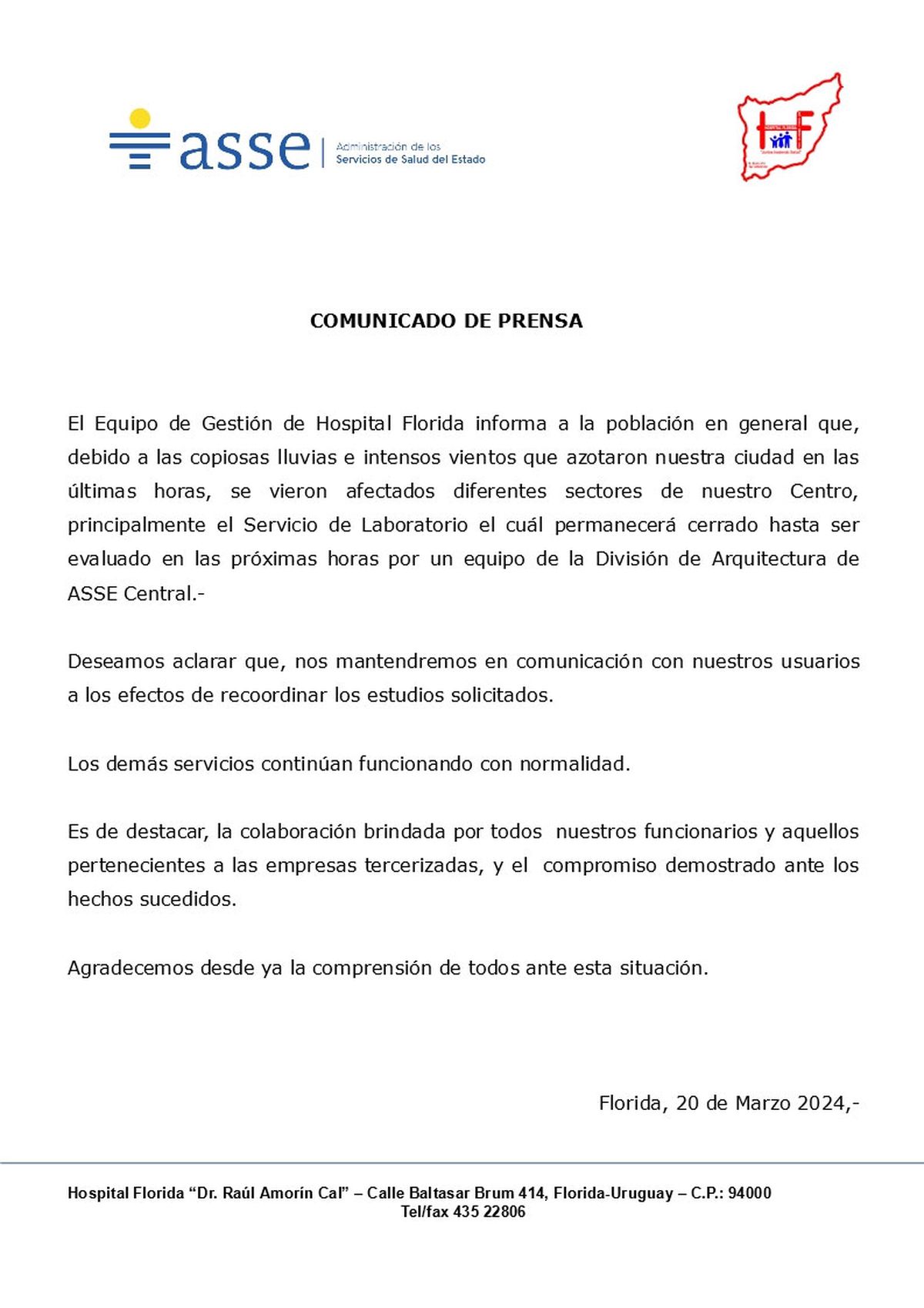 Además, el intendente de Florida Guillermo López informó que se voló el techo del gimnasio municipal, que hubo daños en un liceo y que también hay destrozos en el hospital de ASSE, con afectación especial en el área de laboratorios, según detalla en un comunicado la Administración de los Servicios de Salud del Estado.