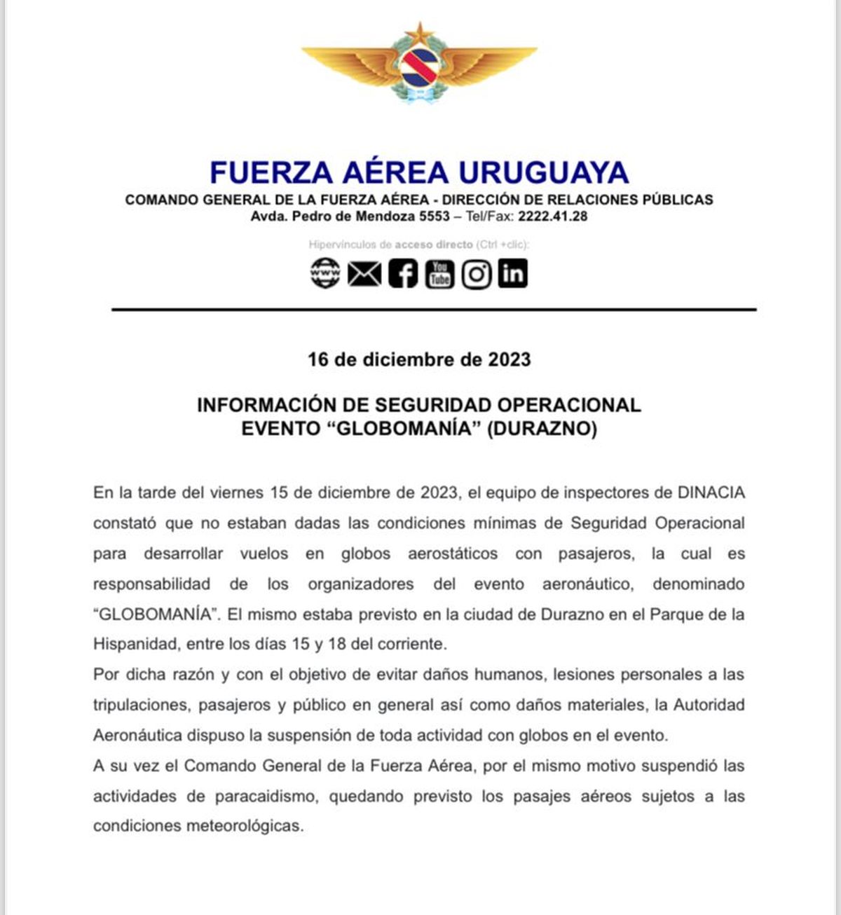 La Fuerza Aérea (FAU) resolvió la suspensión de los vuelos en globos aerostáticos en el marco del Festival Globomanía, previsto del viernes 15 al domingo 17 en el Parque de la Hispanidad en Durazno.
