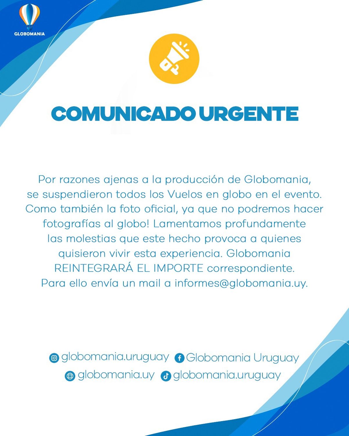 Desde Globomanía, lamentan la suspensión de los vuelos en globo e informan del reintegro de los importes abonados a través del mail: [email protected]
