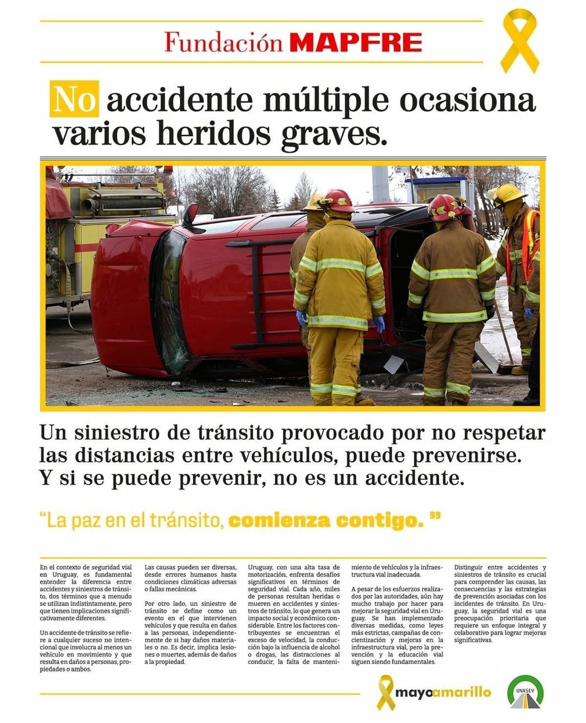 En su compromiso constante con la seguridad y el bienestar de la comunidad, Fundación MAPFRE apoyó la campaña Mayo Amarillo 2024, un movimiento global que buscó reducir el número de muertes y heridos como consecuencia de los siniestros de tránsito. Bajo el lema "La paz en el tránsito comienza Contigo", esta iniciativa celebró su 11° aniversario con el objetivo central de promover una cultura de seguridad vial sólida y sostenible en Uruguay.