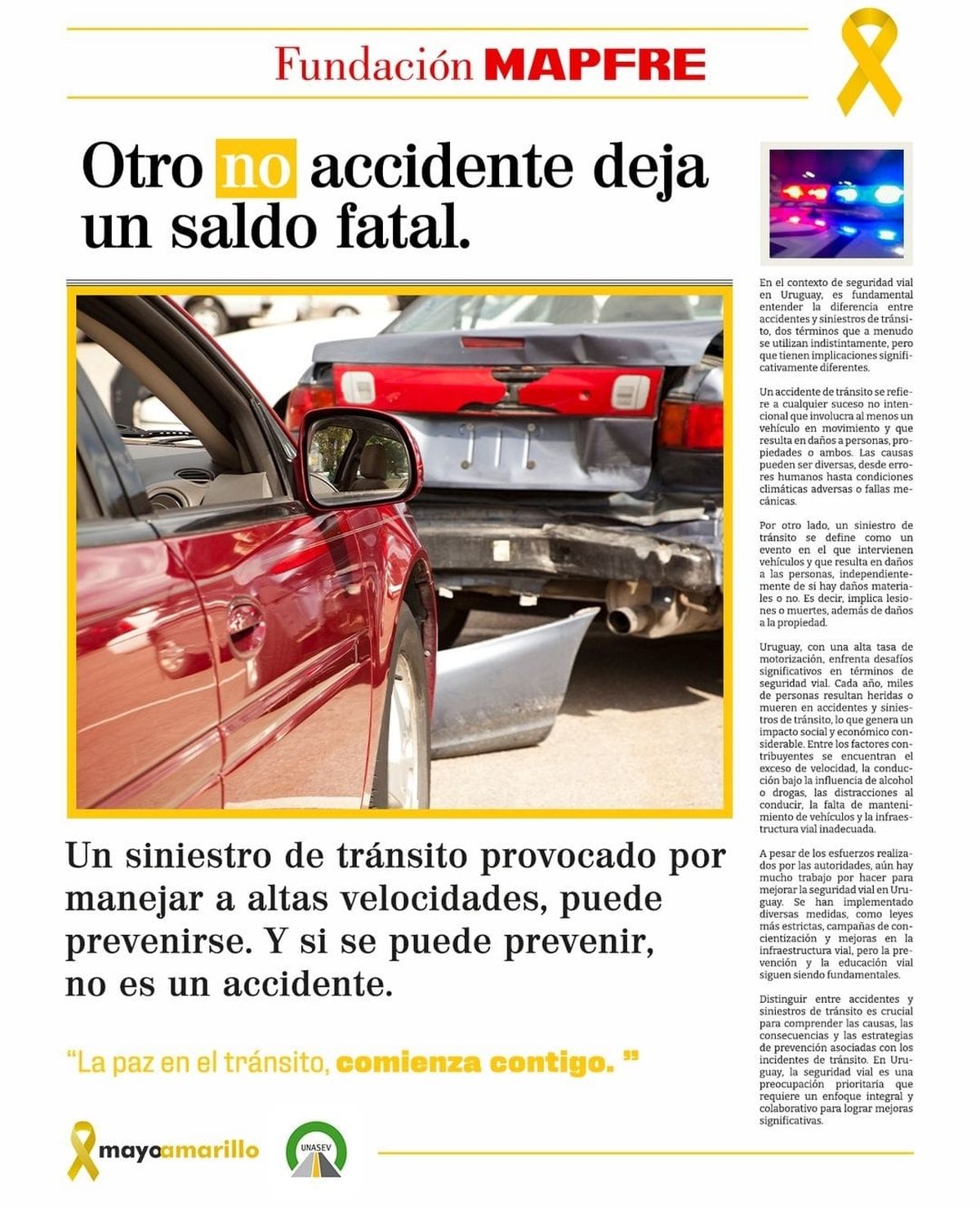 Desde Fundación MAPFRE, se lanzó una campaña específica bajo el concepto "NO ES UN ACCIDENTE". La premisa fue clara: un siniestro de tránsito causado por la falta de respeto a las normas viales, el consumo de alcohol o drogas, o el uso irresponsable del celular al volante no es un accidente inevitable. Estos siniestros pueden y deben prevenirse.