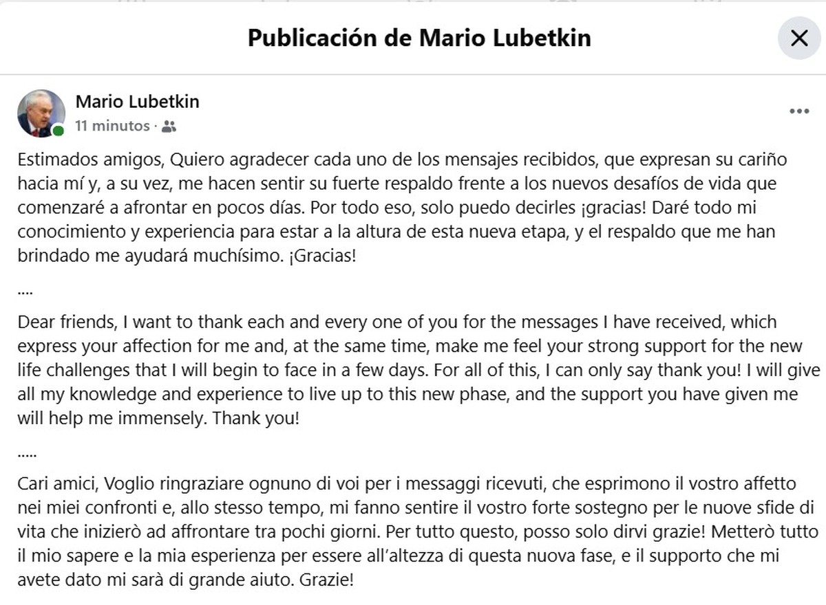 Mario Lubetkin será el canciller en el gobierno de Yamandú Orsi. Este domingo, escribió en Facebook un mensaje dirigido a sus amigos, en tres idiomas: español, inglés e italiano.