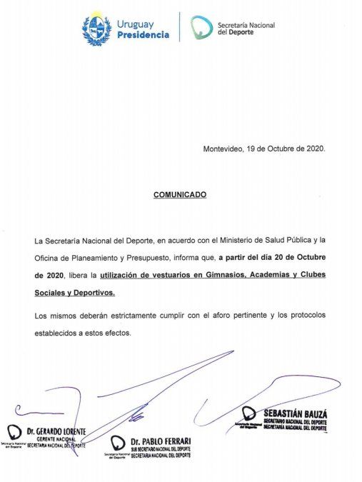 La Secretaría Nacional del Deporte anunció que a partir de este martes se libera la utilización de vestuarios en clubes, gimnasios y academias.
