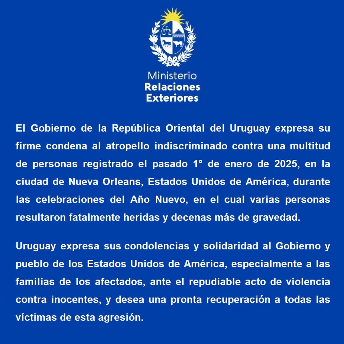 El gobierno uruguayo, a través del Ministerio de Relaciones Exteriores, expresó firme condena del atentado que ocurrió en Nueva Orleans, Estados Unidos, en Año Nuevo.
