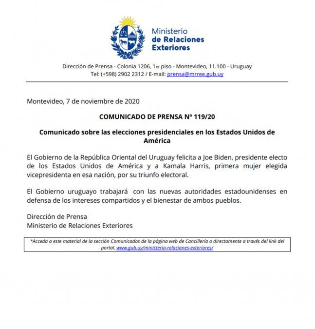 El Gobierno de la República Oriental del Uruguay felicitó a Joe Biden, presidente electo de los Estados Unidos de América y a Kamala Harris, primera mujer elegida vicepresidenta en esa nación, por su triunfo electoral, en un comunicado emitido este sábado por el Ministerio de relaciones exteriores.