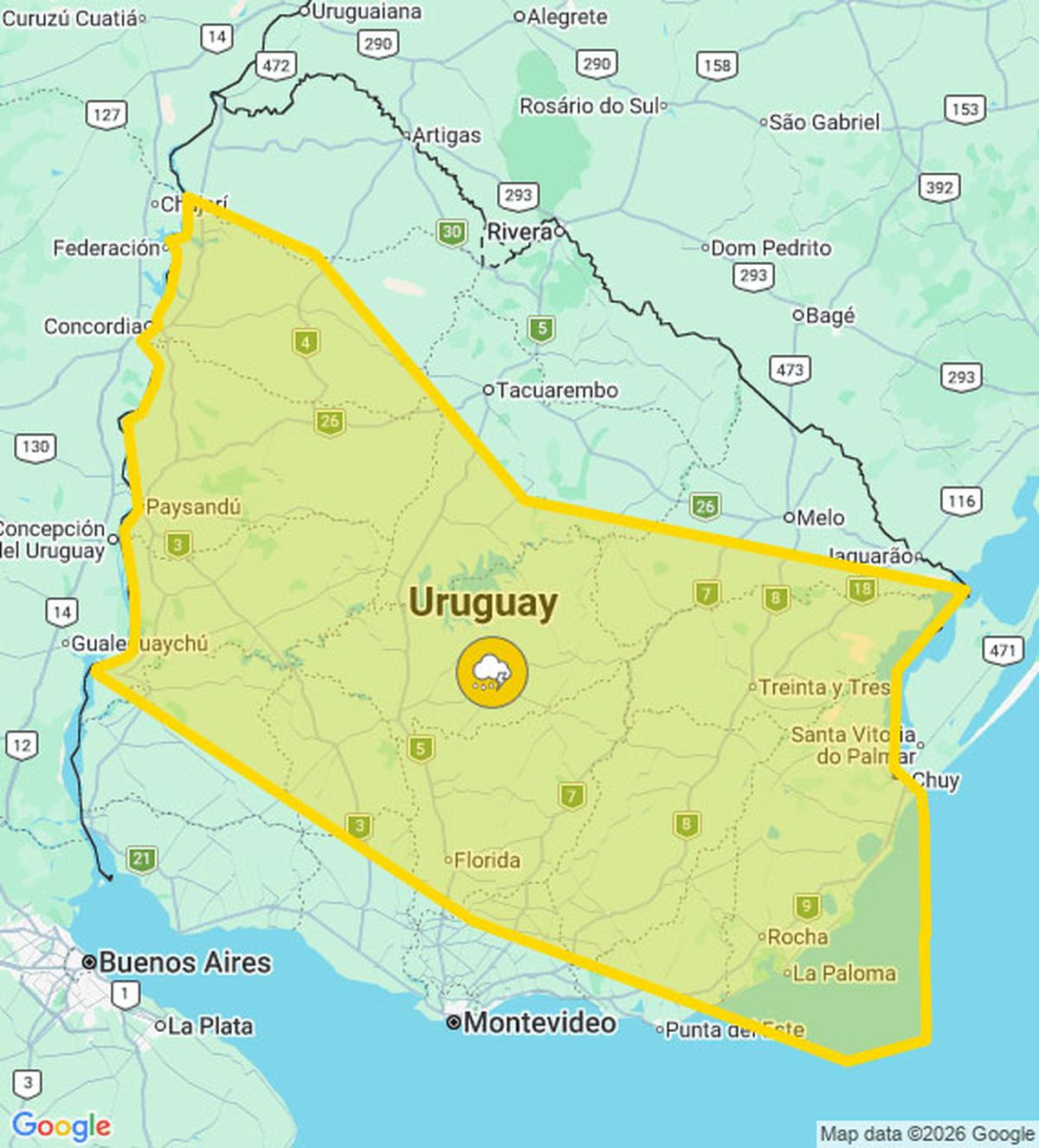 La advertencia amarilla de Meteorología por la persistencia de tormentas puntualmente fuertes y lluvias abundantes rige para gran parte del país, en una franja diagonal desde Artigas y Salto hasta Treinta y Tres y Rocha (ver mapa abajo).